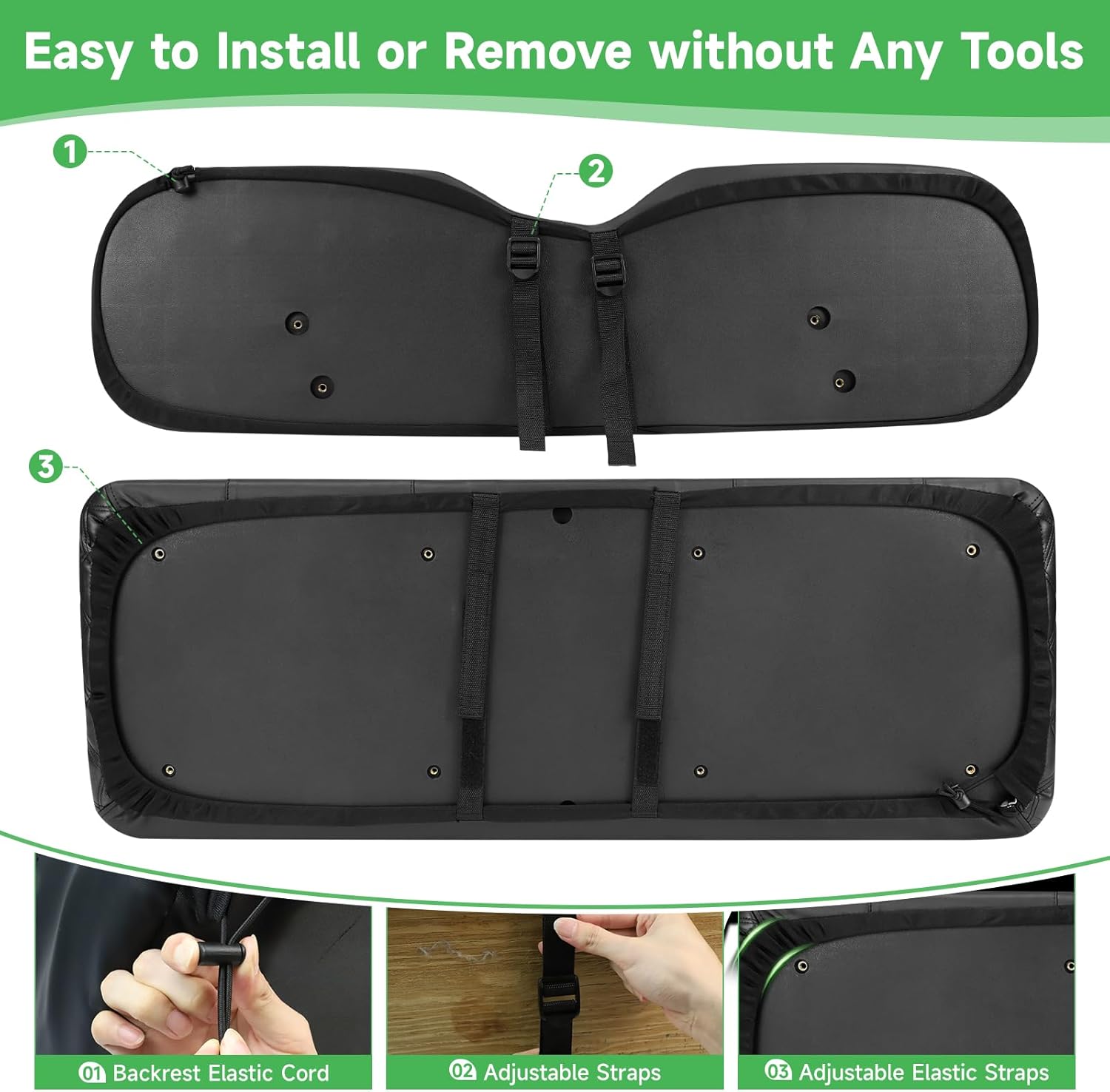 - Simplified Setup: This golf cart rear seat cover is designed for hassle-free installation, requiring no tools or the removal of armrests. The inclusion of straps ensures a smooth installation process, eliminating the need for nails or the removal of the existing vinyl seat cover. Simply drape the cover over your old seat, and with the adjustable shoulder straps and retractable buckles, you can install or remove the seat cover in a matter of minutes