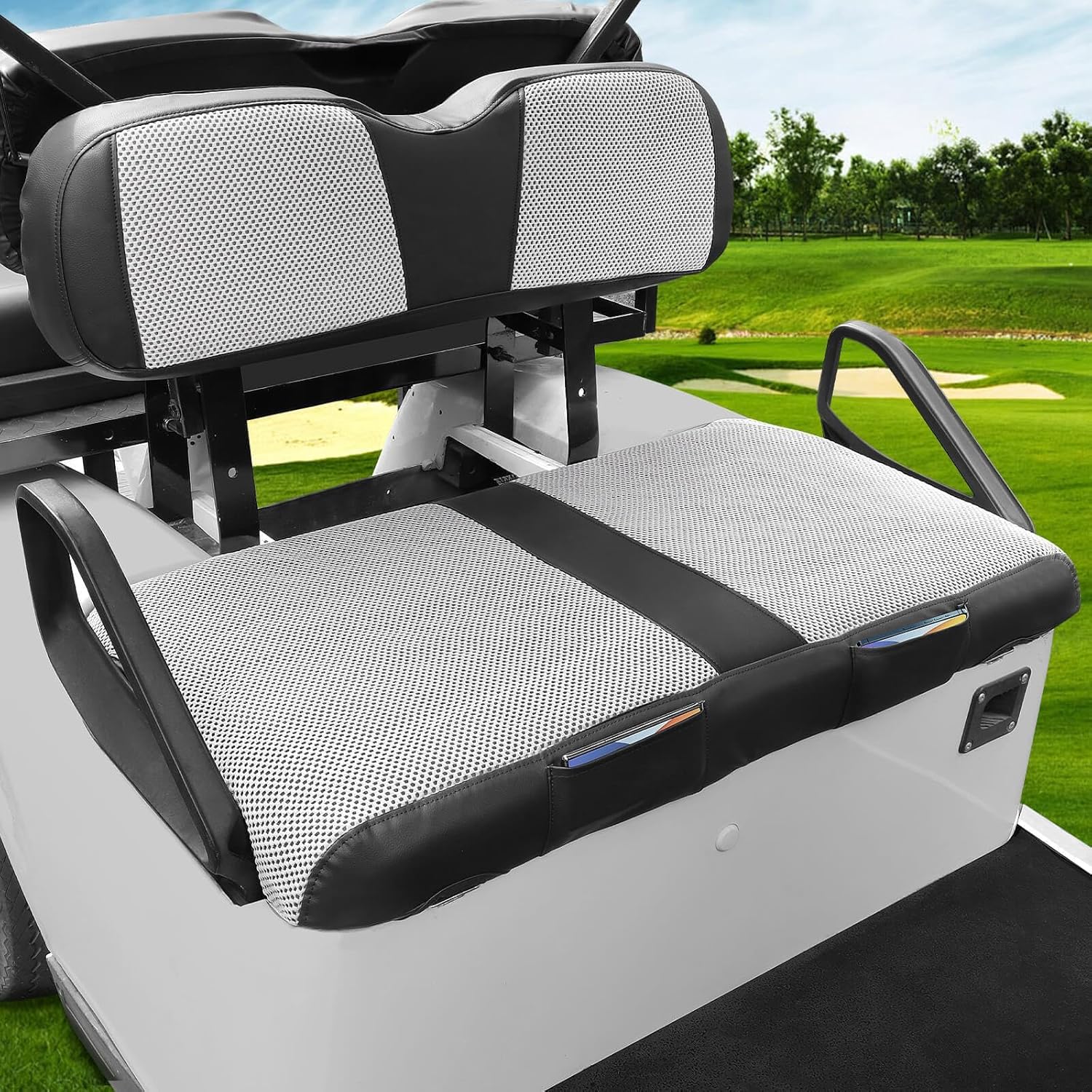 - Stylish Design: EZGO TXT seat cover combines polyester mesh cloth with artificial leather. Using EZGO golf cart seat cover the original seat, make your golf cart look like new again, or protect the new cushion effectively prevent against dirt, wearing, scratches, , extend the life of the seat.