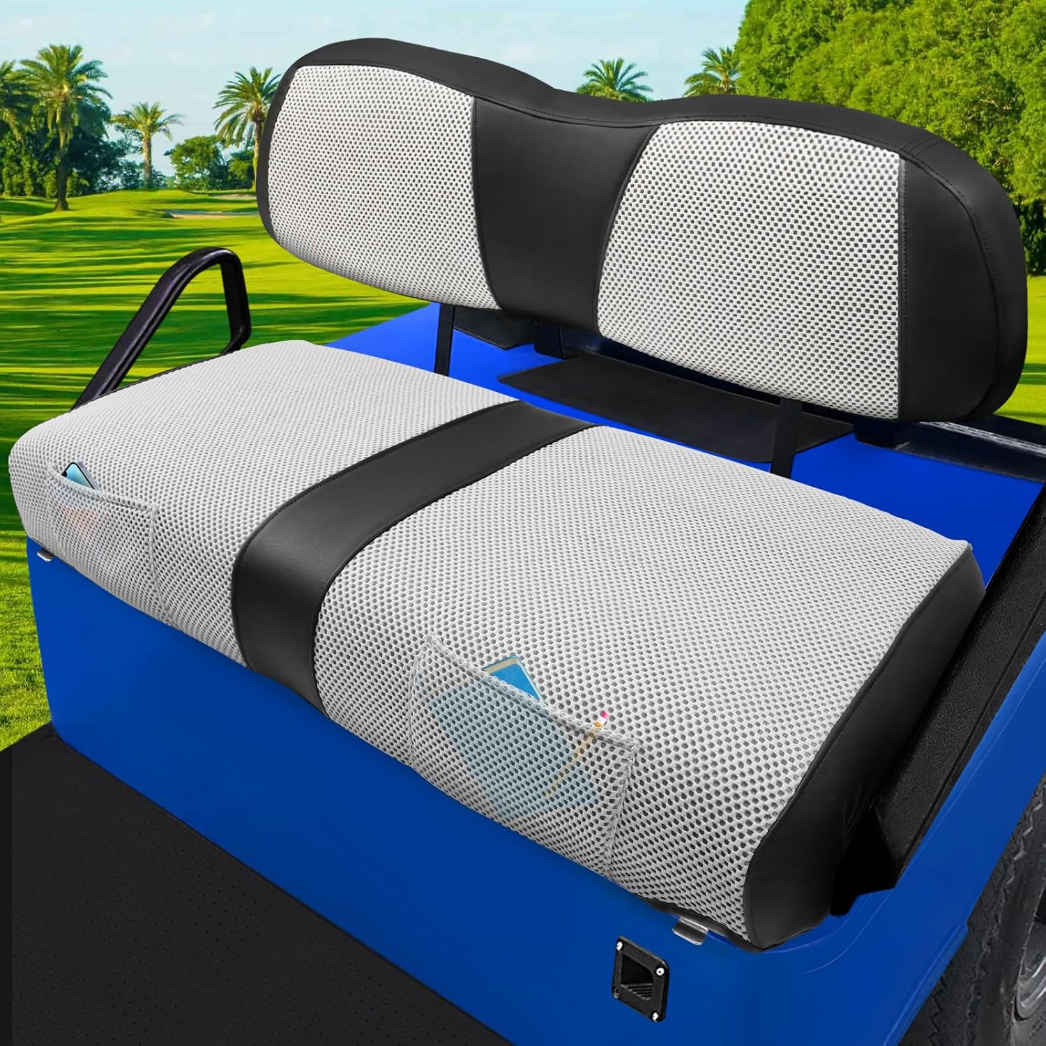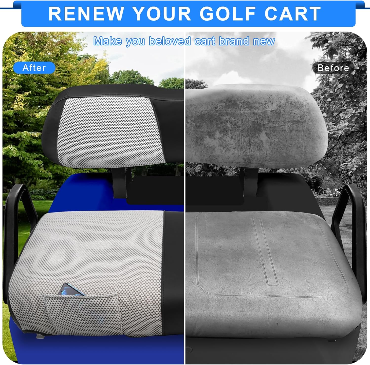- Stylish Design: This upgraded club car ds golf cart seat cover combines fabric cloth with artificial leather, featuring a distinctive mesh sandwich design. Full wrap-around design make the seat cover fit club car ds (2000.5-present) original front seat and backrest ideally, giving your golf cart an individual look.