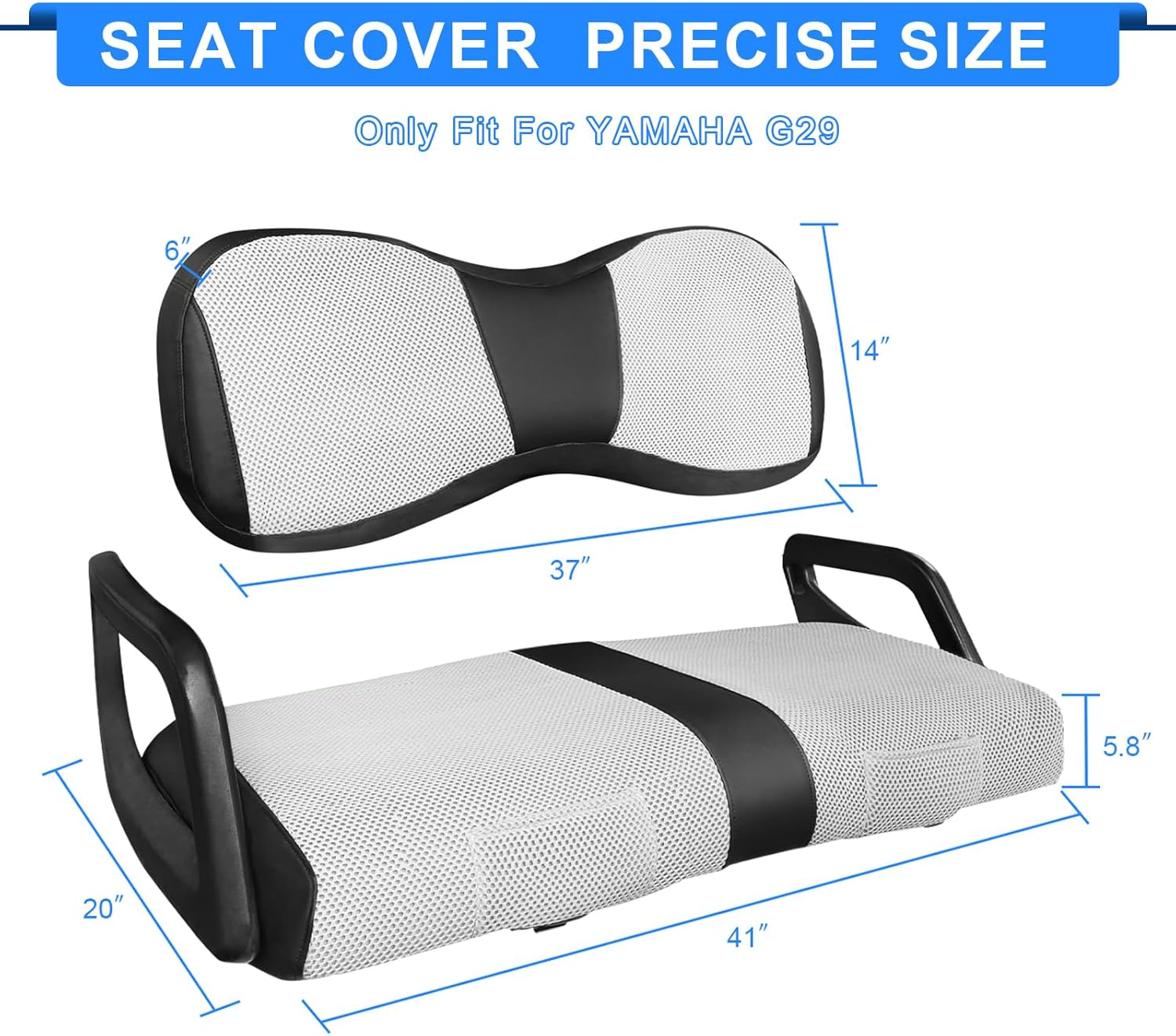 - Applicable Models: Golf cart front seat cover fit for yamaha g29 OEM front seats models. Not suitable for custom front seat cushion. The golf cart seat covers includes a front backrest cover (approach 37 X 14 X 6 inches) and a front bench seat cover (approach 41 X 20 X 5.8 inches). Please check and measure again your golf cart yamaha g29 before purchase