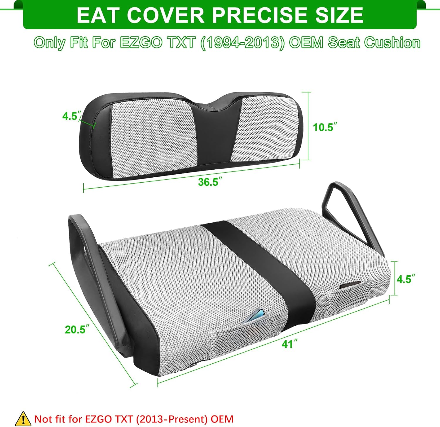 - Stylish Design: This upgraded EZGO TXT Golf Cart Seat Cover combines fabric cloth with artificial leather, featuring a distinctive mesh sandwich design. Full wrap-around design make the seat cover fit EZGO TXT (1994-2013) Original front seat and backrest perfectly, giving your golf cart an individual look