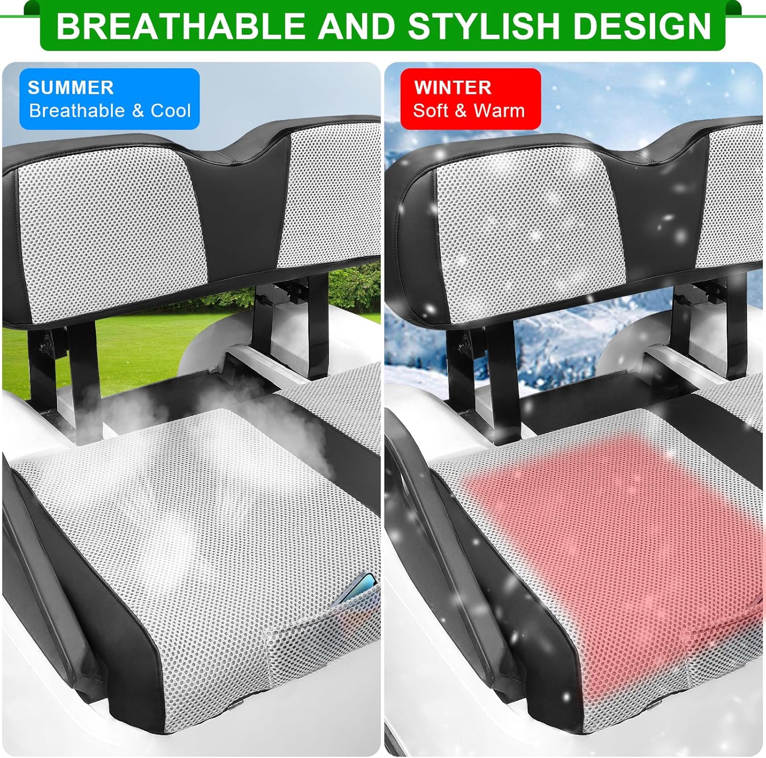 - Suitable For All Seasons: The fabric addition makes the entire golf cart seat cover more breathable. With breathable fabric and partial leather in a new sandwich-style design, this seat cover stays breathable in summer and provides warmth in winter. This front seat cover is perfect for year-round use, regardless of the season