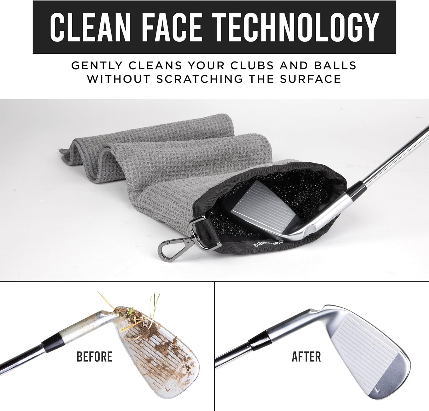 - CLEAN FACE TECHNOLOGY The Club Scrub Towel Pro utilizes Clean Face Technology that gently cleans your clubs and balls without scratching the surface to ensure proper contact, spin, flight, and roll with every stroke.