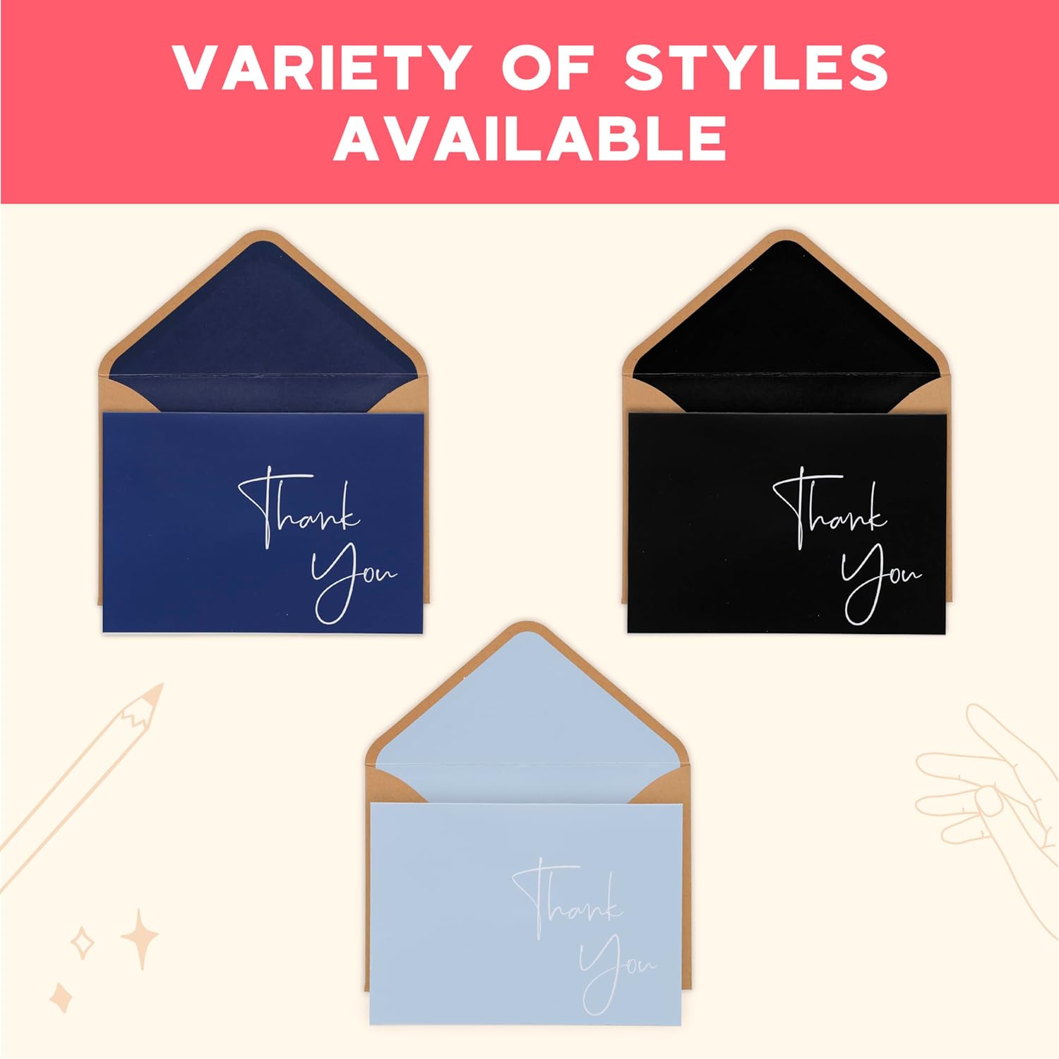 - Classy design for any occasion: Each box set of 20 thank you cards come with matching lick-to-seal sturdy kraft envelopes with a blue interior lining as well as a matching themed sticker to seal the envelope and tie it all together. Be sure to always have a pack of greeting cards on hand, whether you need to thank a friend, send a special note, or make some staff appreciation cards!
