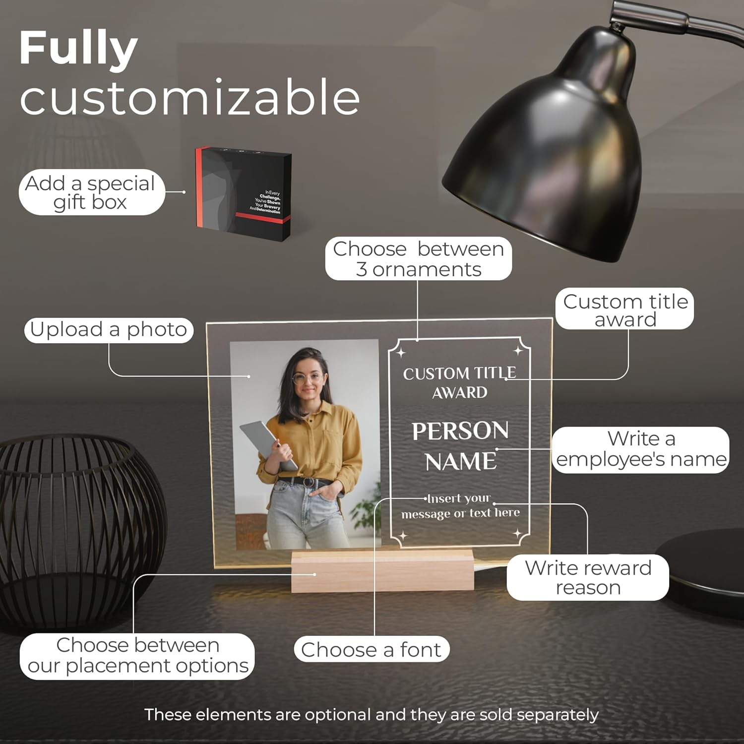 - Choose from 5 Elegant Base Options β Enhance your acrylic plaque with a stylish base: wood, black acrylic, clear acrylic, or LED light options (warm or RGB). Perfect for office desk setups, work anniversary gifts, or employee appreciation decorations during company celebrations.