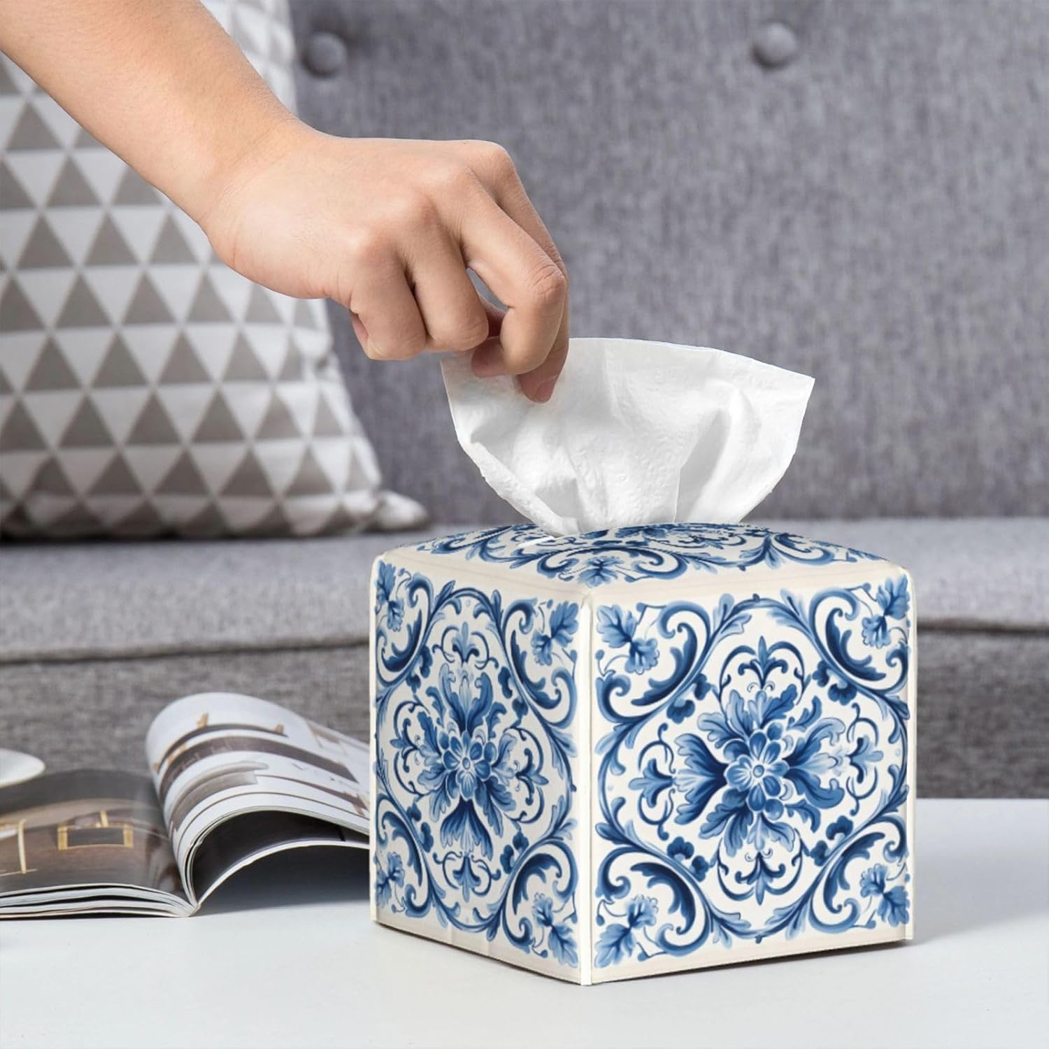 Tissue Box Cover Blue Flower Paisley Square PU Leather Tissue Box Holder for Car Bathroom Bedroom Desk Tabletop Decor