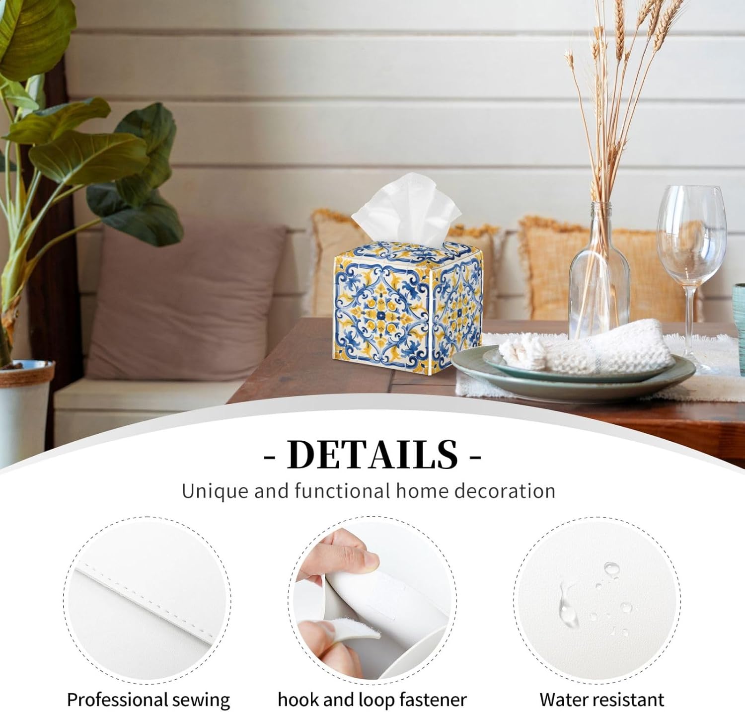 Tissue Box Cover Yellow Blue Ornament Tiles Square PU Leather Tissue Box Holder for Car Bathroom Bedroom Desk Tabletop Decor