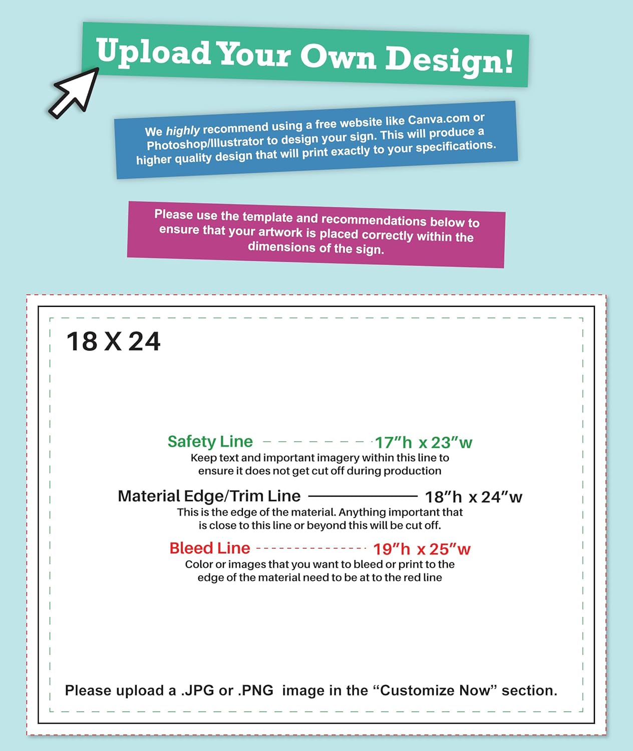 - IMPORTANT: Signs can only be printed in landscape (horizontal) orientation. Orders received with artwork rotated to print in vertical orientation will be canceled as these will not be compatible with the included wire stakes.
