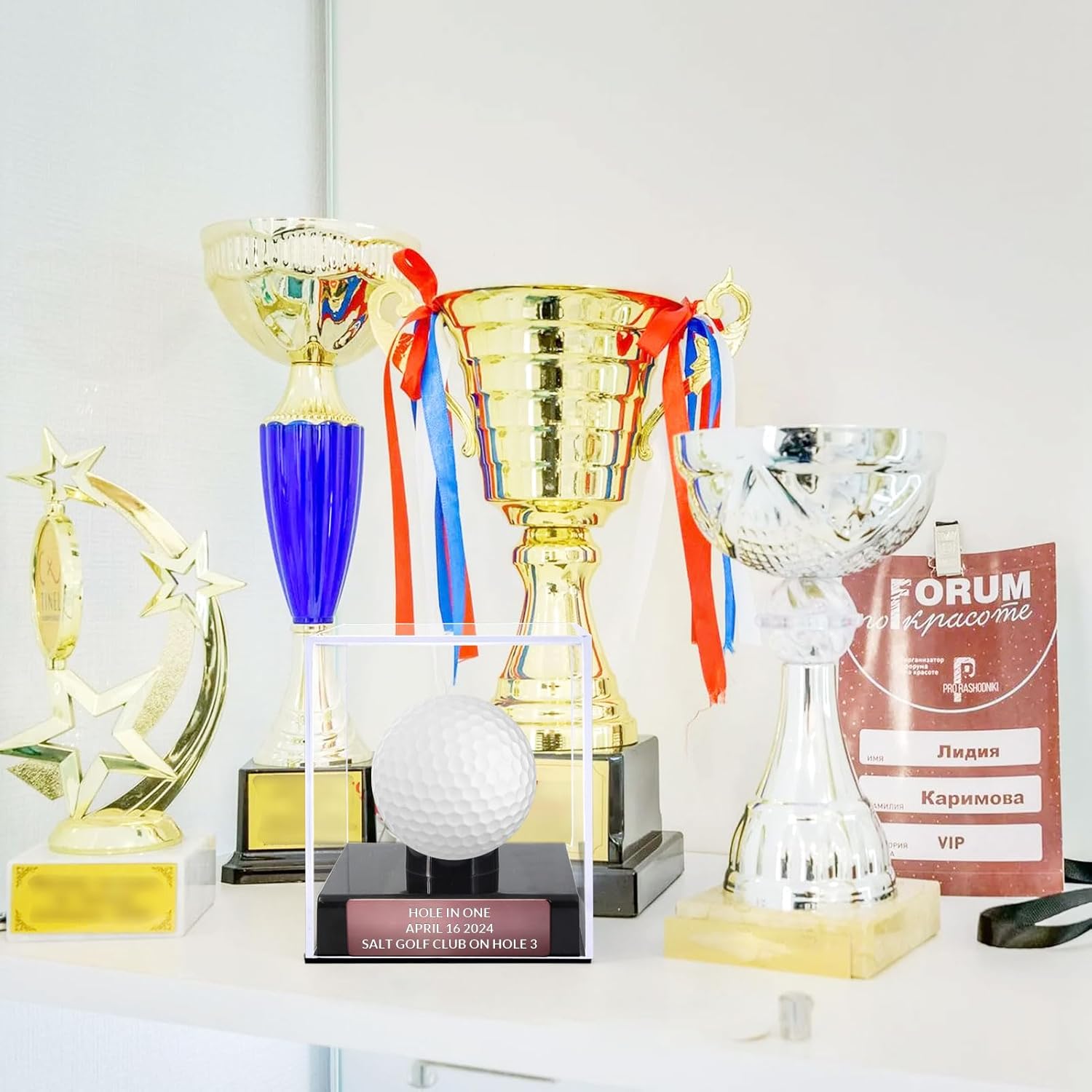- CUSTOM LASER ENGRAVING PLAQUE: Includes a laser engraved plaque for personalization, allowing you to memorialize special golf outings, tournaments, or golfing achievements. Personalize your golf ball case with golf-related victories such as Hole In One, Longest Drive, Birdie, Lowest Round, Eagle, Albatross, and First Under 80 PAR. This golf ball display case is the perfect way to celebrate your golf achievements or create a personalized gift.