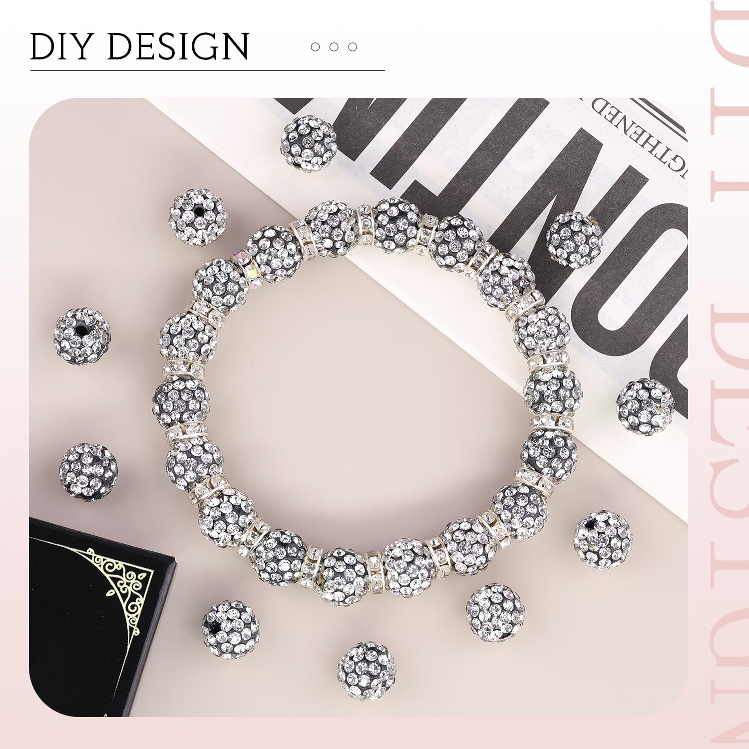 150pcs 10mm Rhinestone Beads for Jewelry Making, Black White Shiny Round Shamballa Disco Ball Beads, Sparkle Crystal Clay Christmas for Bracelet Baseball Necklace Earring Crafting and DIY