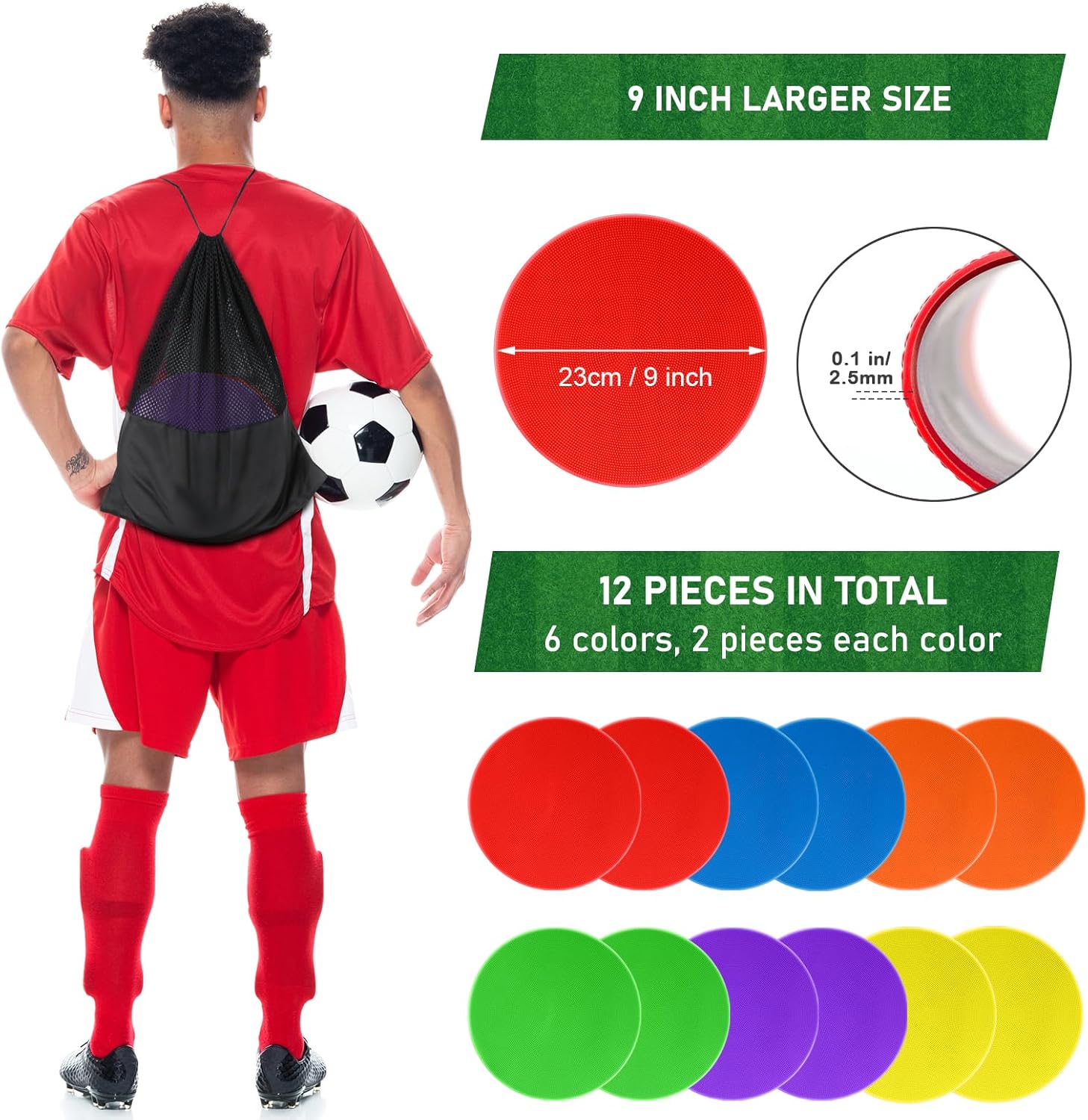 - 【A SET OF 12 POLY SPOT MARKERS】You will receive 12 pieces of floor spot markers and a drawstring bag for easy placement and carrying. Size: 9inch/23cm diameter, 0.1inch/2.5mm thickness. 6 different colors, each color two piece