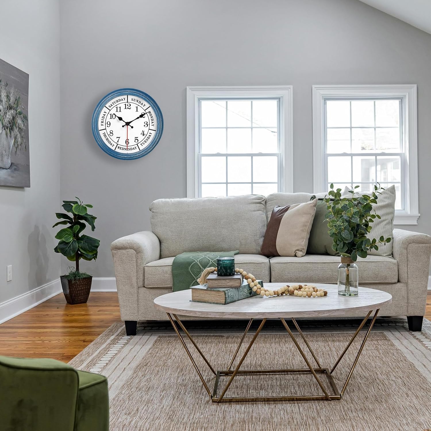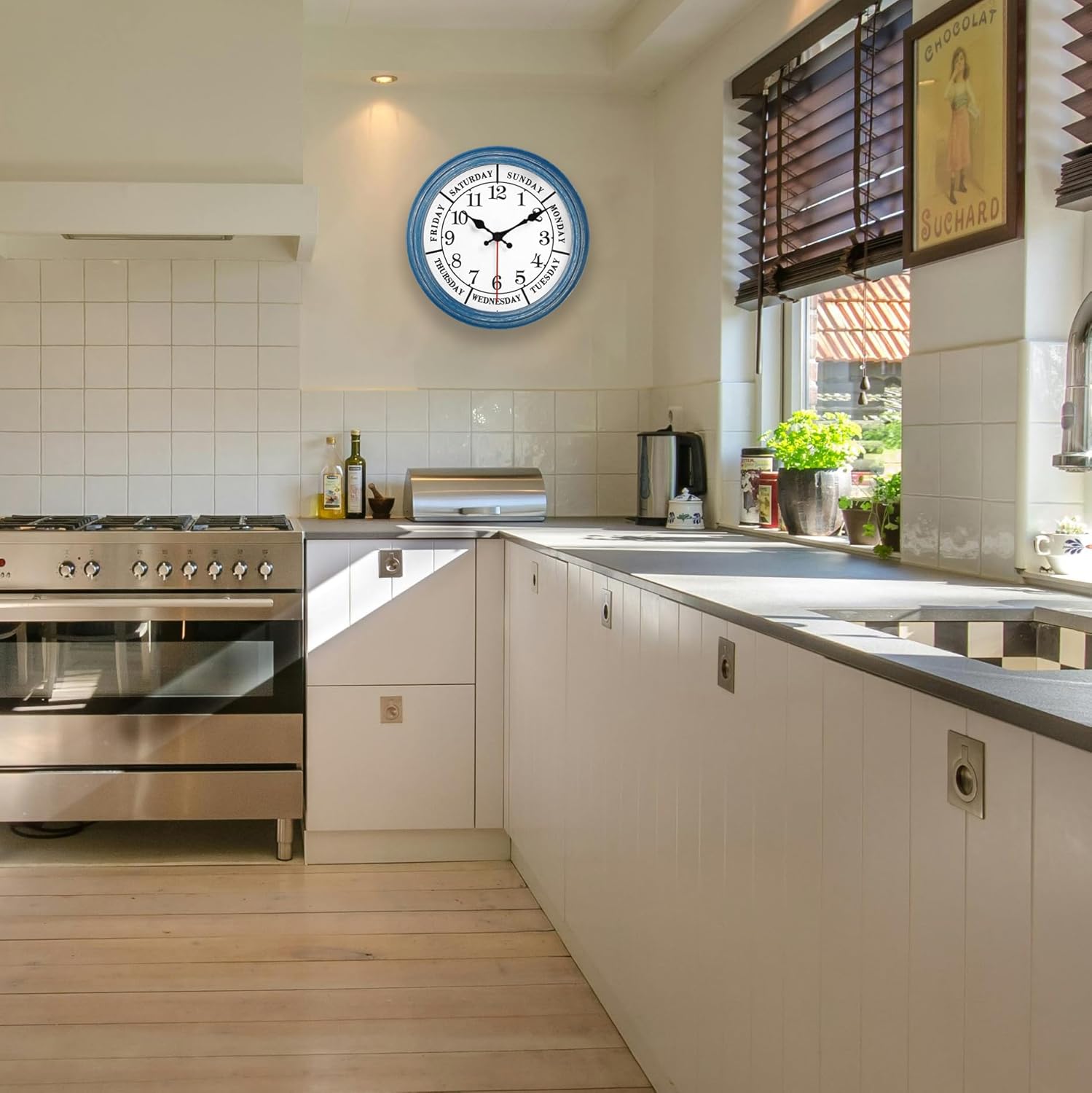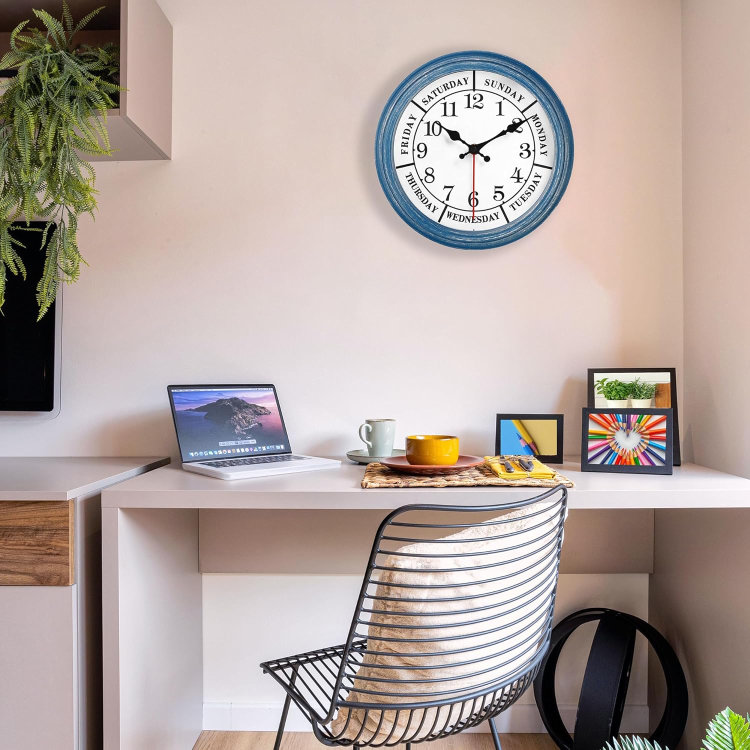 JENLYSTIME 12 Inch Retro Wall Clock,Classic Day of The Week Wall Clock,Silent Non Ticking Battery Operated Movement(Blue)