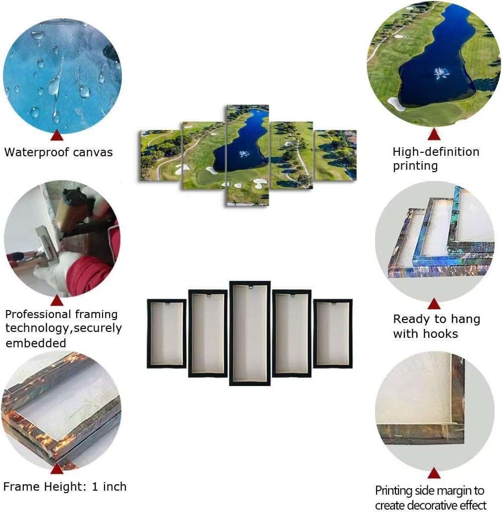 - 💝Golf course wall art size: 50Wx24H inch. Each panel size: 10x12inchx2,10x16inchx2,10x24inchx1,golf canvas prints easy ready to hang.