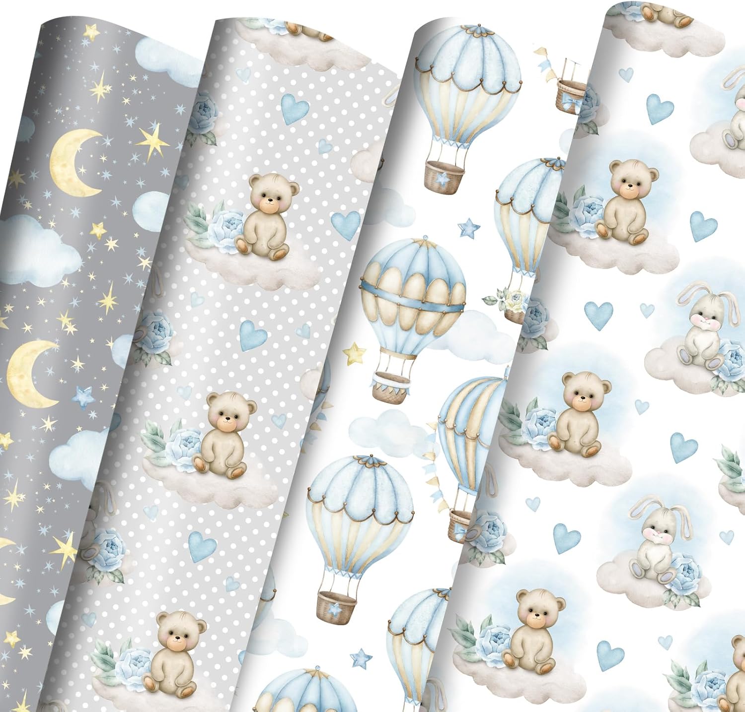 - BABY SHOWER DESIGN:Looking for baby shower wrapping paper to give to your baby boys,baby girls,kids,friend baby or significant other,our cute bear,funny toys,balloons,moons, cloud print gift wrap is just the surprise you've been looking for that will make sure all eyes are on your gift!