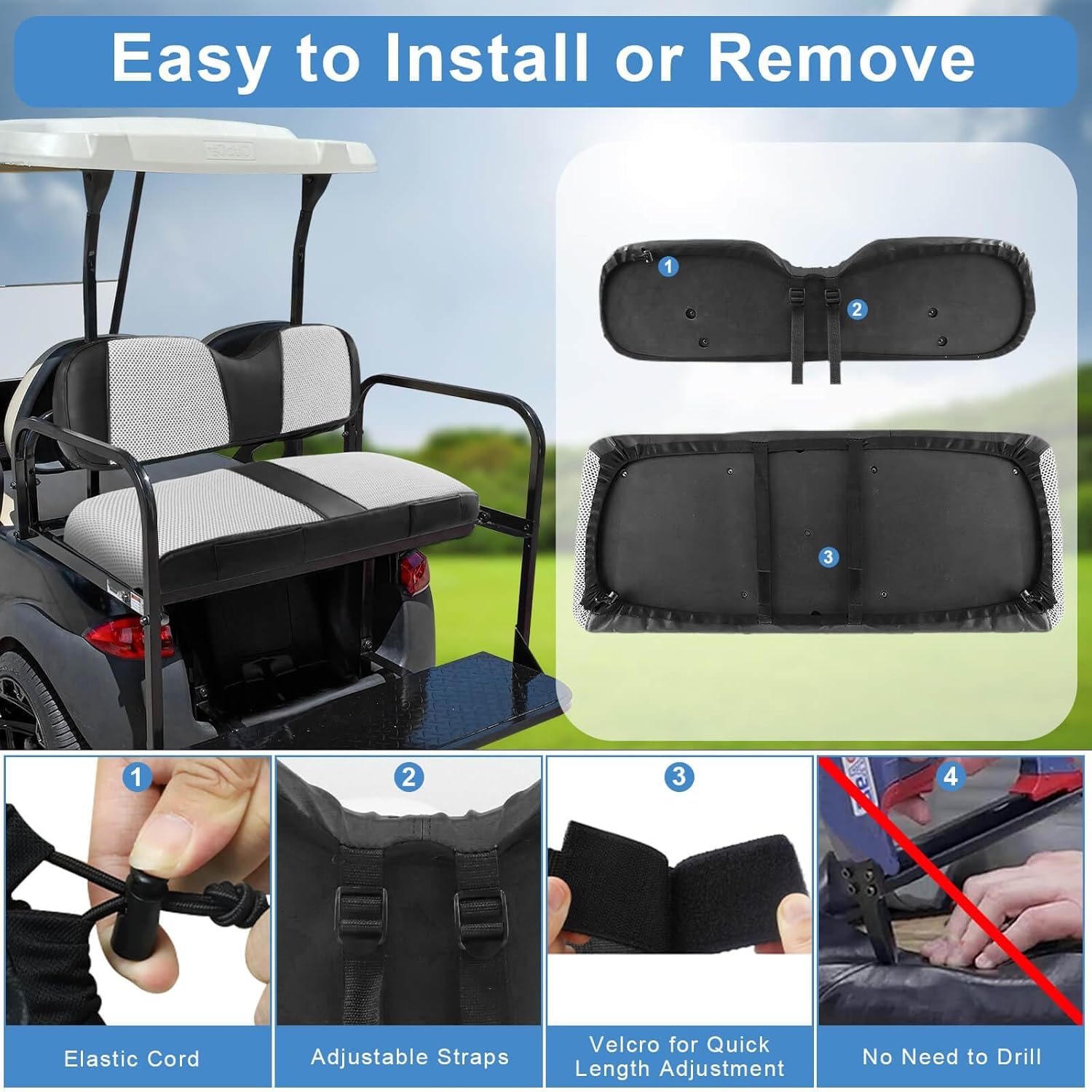 - Stylish Design: Golf cart rear seat cover combines polyester mesh cloth with artificial leather. Using Golf cart rear seat cover the original seat, make your golf cart look like new again, or protect the new cushion effectively prevent against dirt, wearing, scratches, , extend the life of the seat
