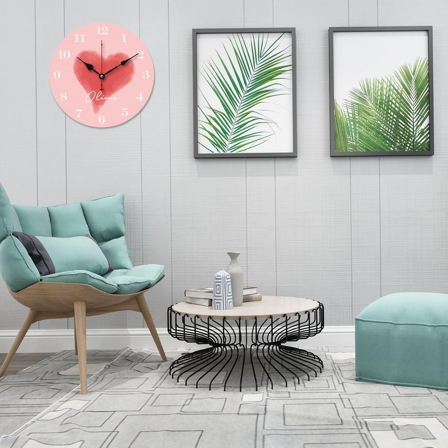 Red Heart Personalized Wall Clocks for Walls,Decorative Kids Wall Clocks Battery Operated 12 inch,Kids Girls Name Wood Wall Clock for Nursery Kids Bedrooms Boys Girls Playroom Decor,Custom Kids Gifts