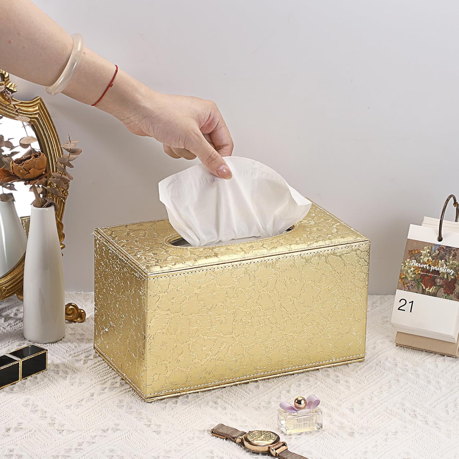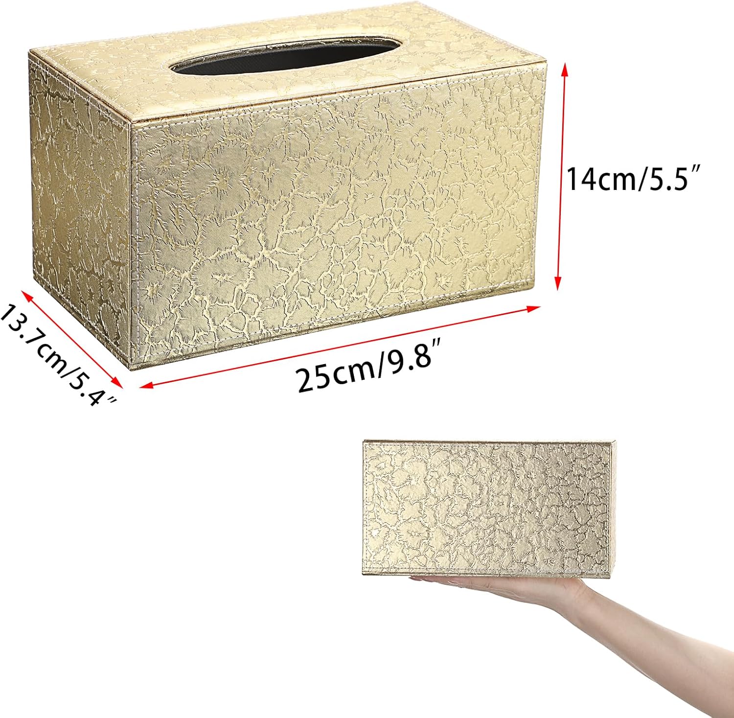 - High Quality - Attractive rectangle tissue box cover is made of high quality MDF(inside) + faux leather (outside) materials; It's sturdy to keep the tissue box from being crushed; The stitching is not only even and neat, but also contrasts nicely with the gold material.