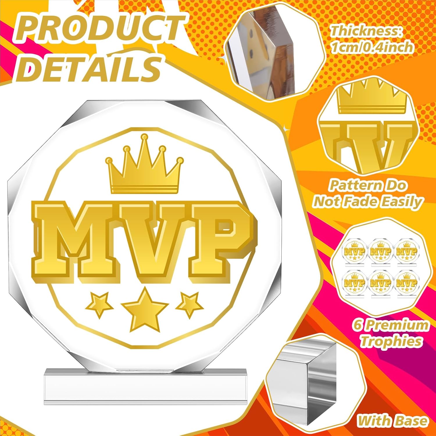- Appropriate Size: with dimensions of 4.72 x 4.72 inches, the compact size of the MVP medal makes it easy to handle and display; Despite the size, it stands with a robust demeanor, highlighting its sturdy build, which is a result of its quality acrylic construct; The size of base plate is about 3.54 x 0.59 inches