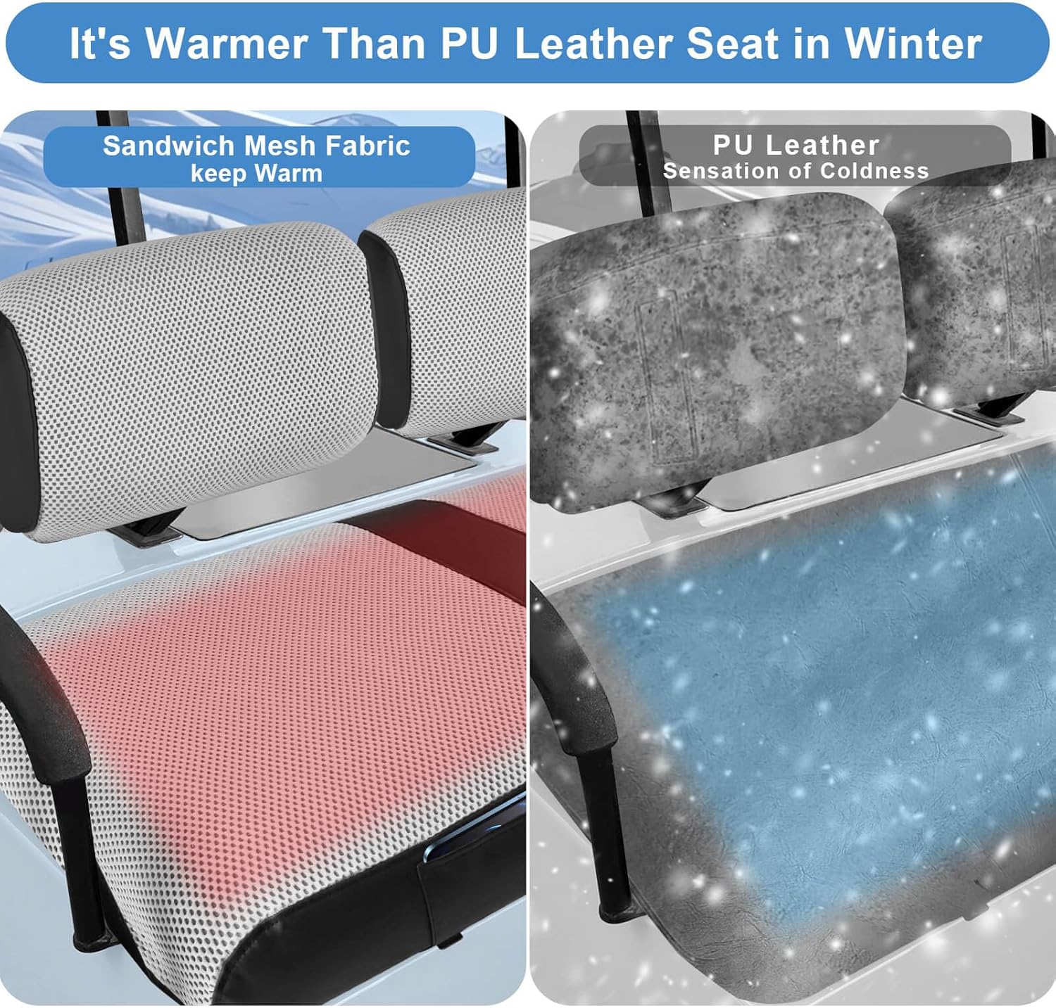 - Unique Design: Featuring distinctive mesh design allows air circulation, soft and comfortable, it has the characteristics of warm winter and cool summer that you stay comfortable during your drive. Golf cart polyester mesh cloth seat cover seams are well stitched, extend the life of the seat cover