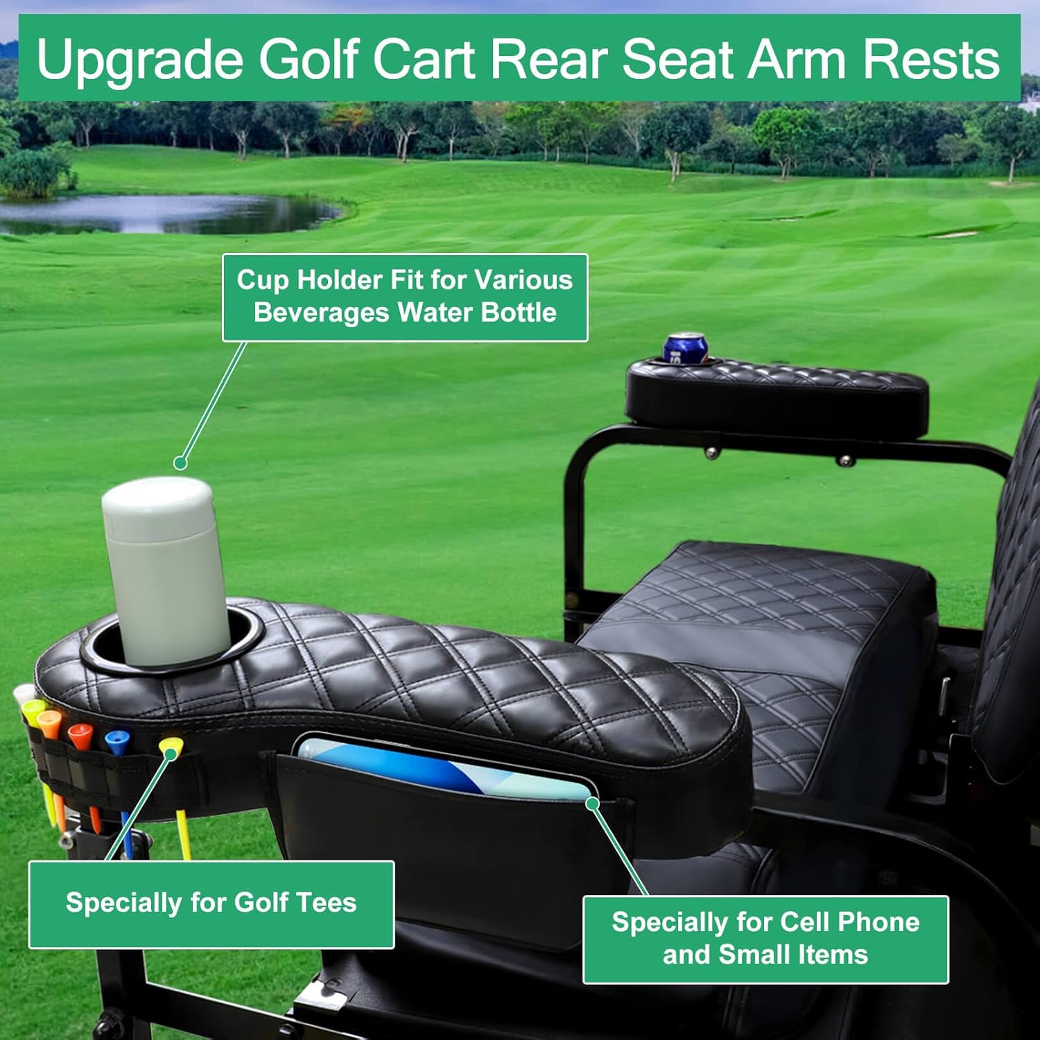 - Upgrade Phone Storage Pouch: Golf cart armrest with Phone storage pouch on the side, perfect for conveniently storing phones and keys. Golf cart armrest with dedicated elastic bands at the front for golf tees