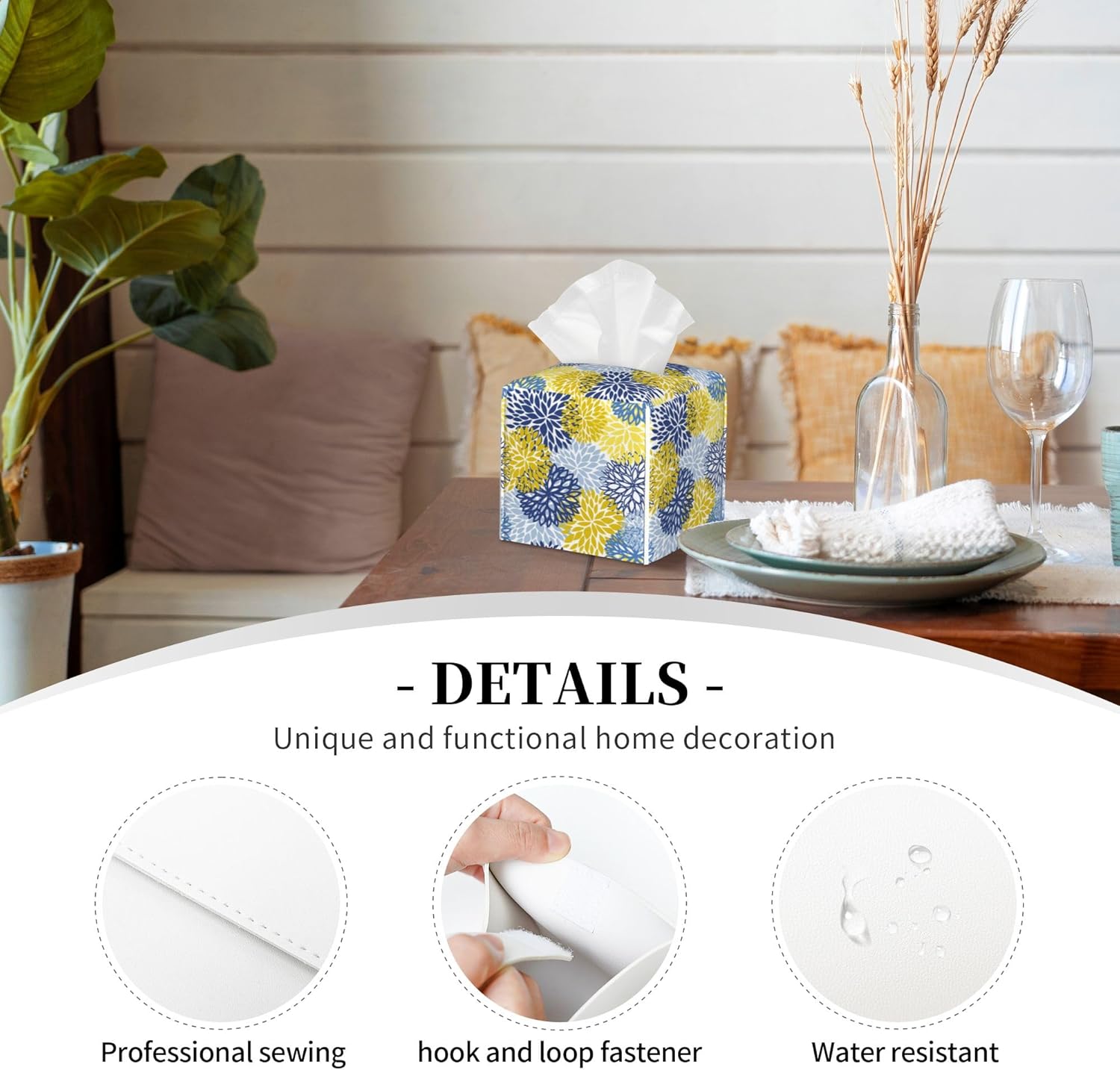 Yellow and Navy Chrysanthemum Flower Tissue Box Cover Leather Tissue Box Holder Square Facial Paper Organizer Dispenser for Bathroom Kitchen Bedroom Vanity Countertop Night Stands
