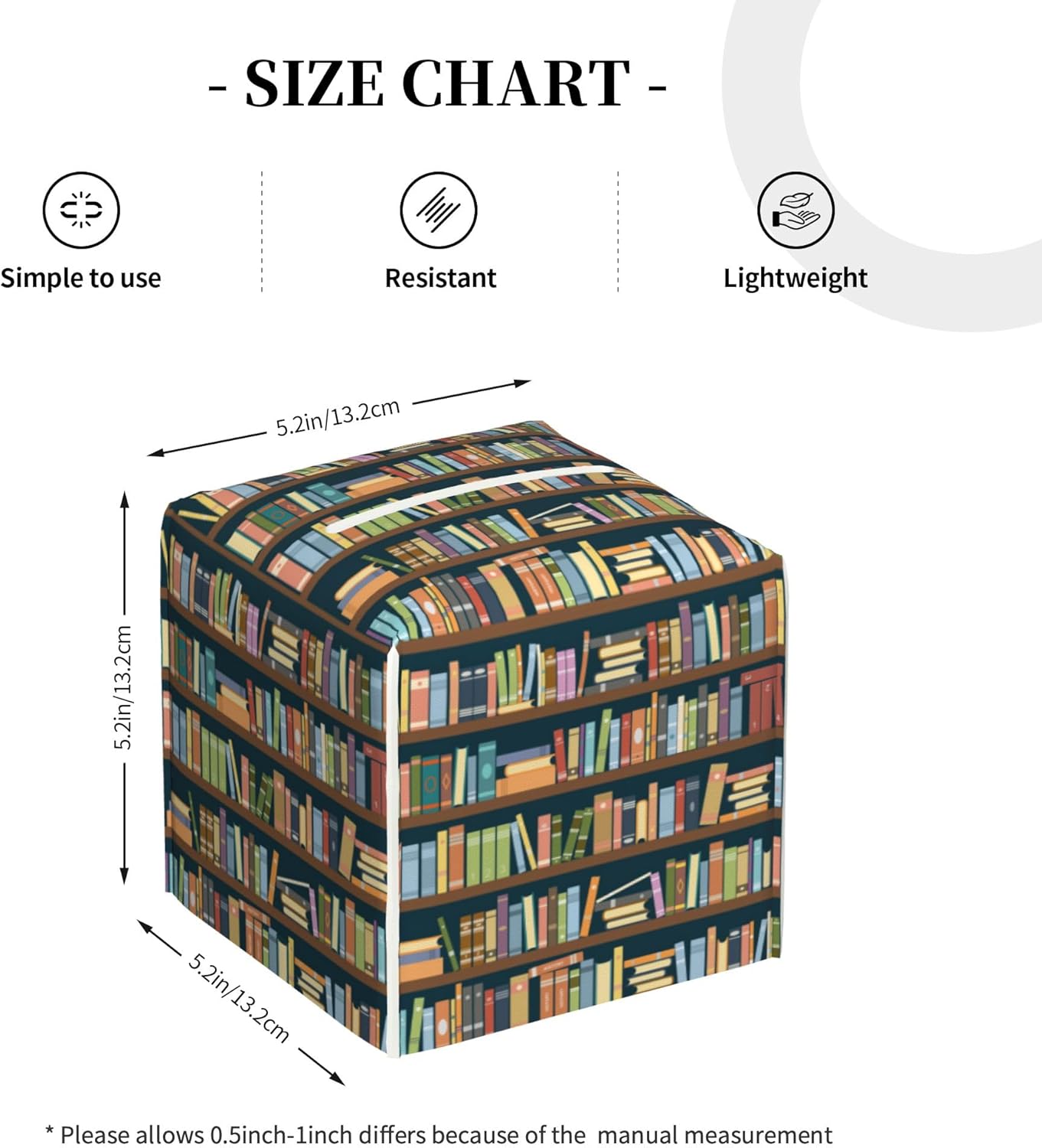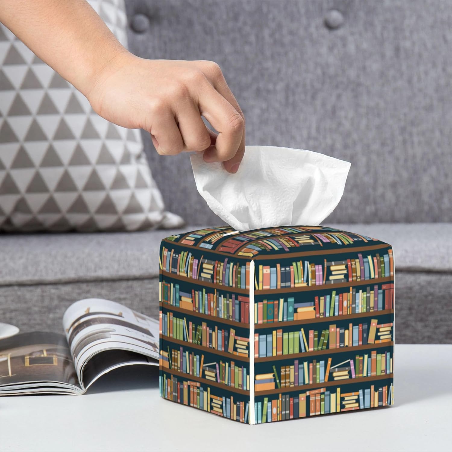 Tissue Box Holder Bookshelves Full of Books Tissue Box Cover Square Leather Tissue Holder Organizer Portable Decorative Facial Paper Case for Home Office Bathroom Vanity Countertop