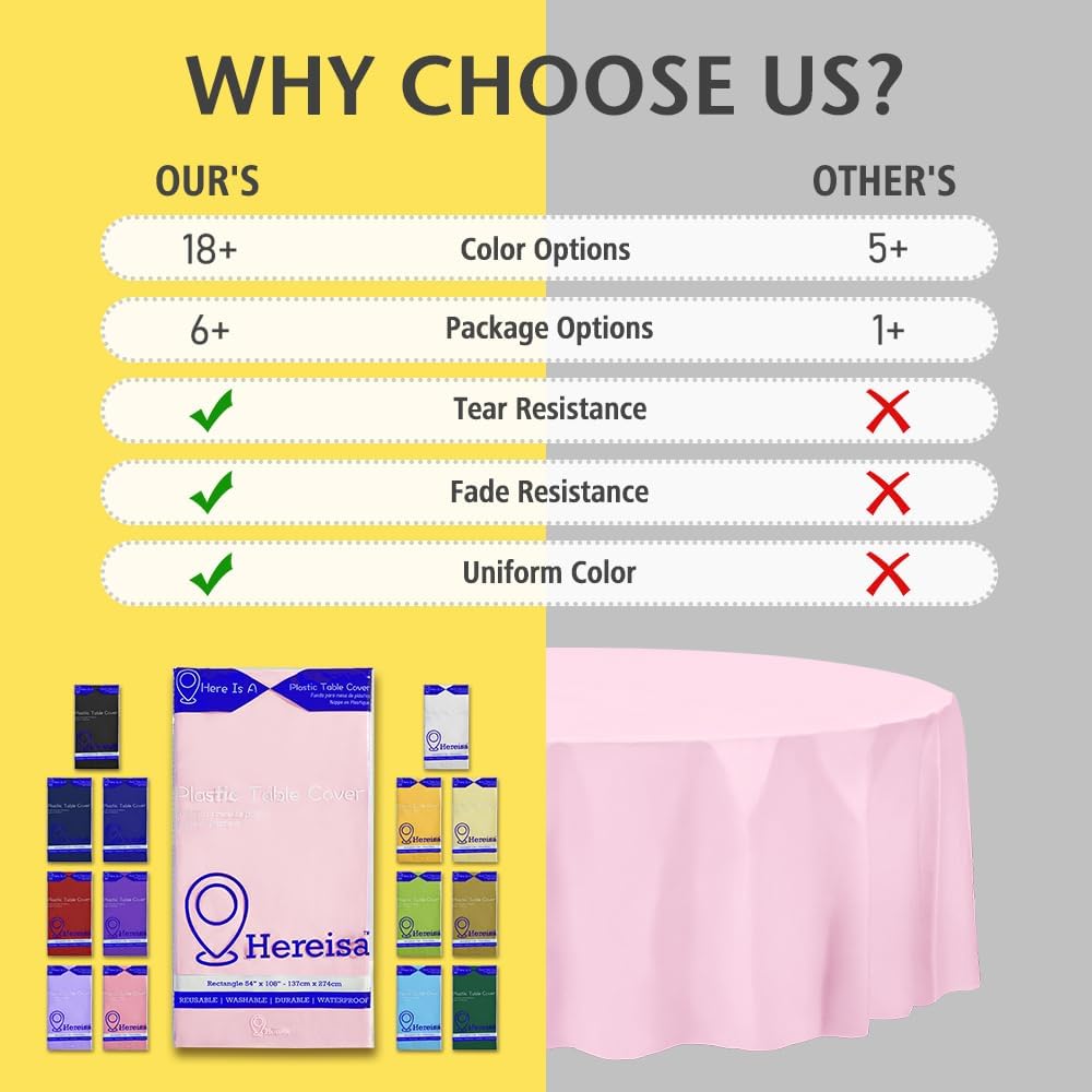- ๐ AVAILABLE IN DIFFERENT COLORS: Let your imagination run wild! These round plastic tablecloths come in a wide range of colors and styles to suit your particular mood so you can accommodate different party themes!