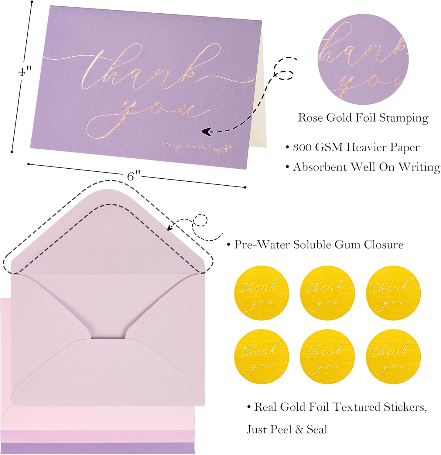 Crisky 50 pcs Lavender Shade Thank You Cards With Envelopes & Stickers Simple Chic Elegant Greeting Cards Perfect for Wedding/Business/Birthday/Graduation 4 x 6 inches
