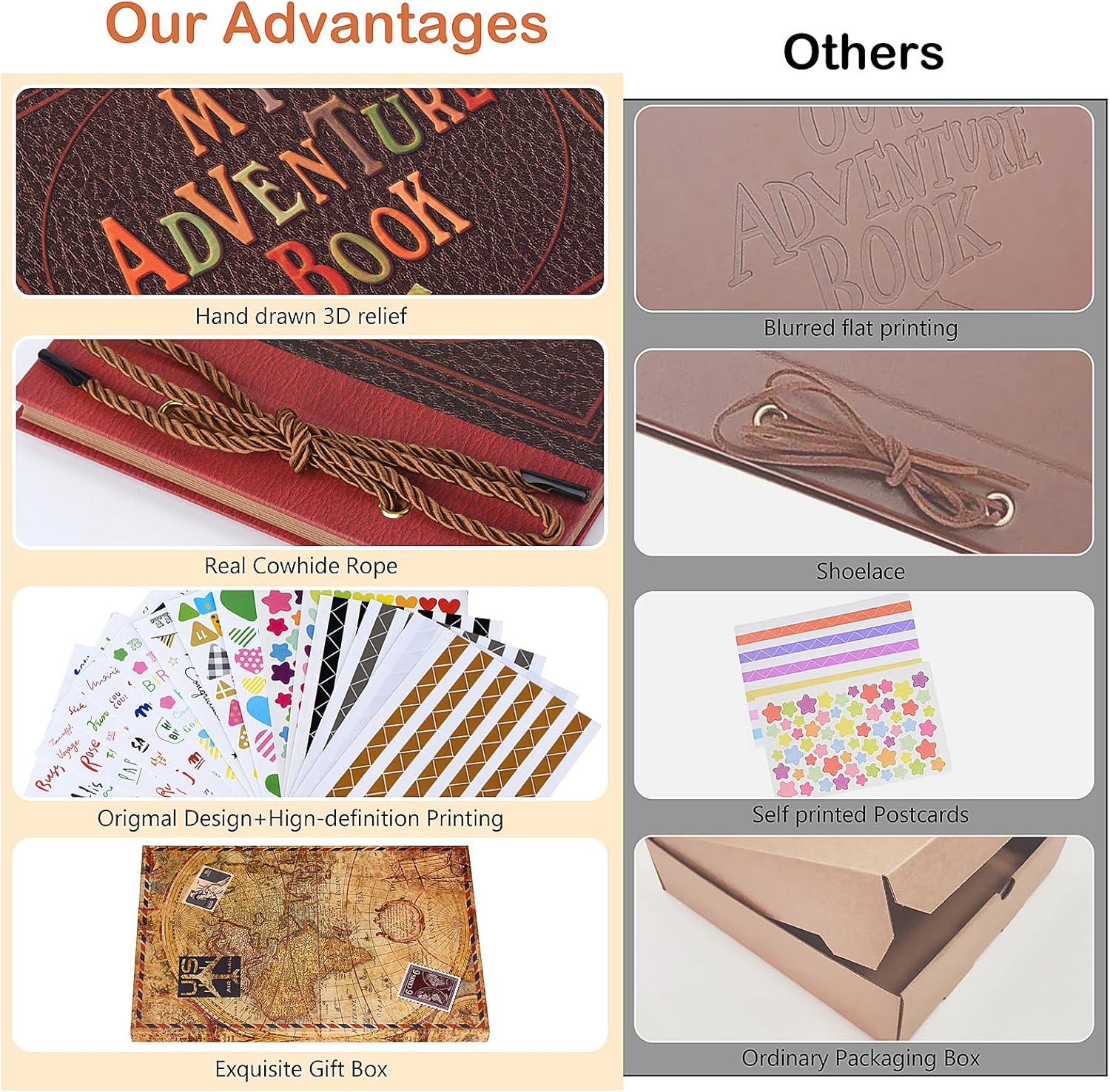 - 🎈【High Capacity and Quality】This album measures 10.24 x 7.09 x 0.39 inches and can hold over 100 photos or postcards. It features 20 sheets (40 pages) plus an additional Baby Album Home Page, providing ample space for capturing and displaying precious memories. Additionally, this adventure book doubles as a notebook with smooth, writable pages, perfect for jotting down notes, thoughts, and memories. It's perfect for documenting your journey on its pages.