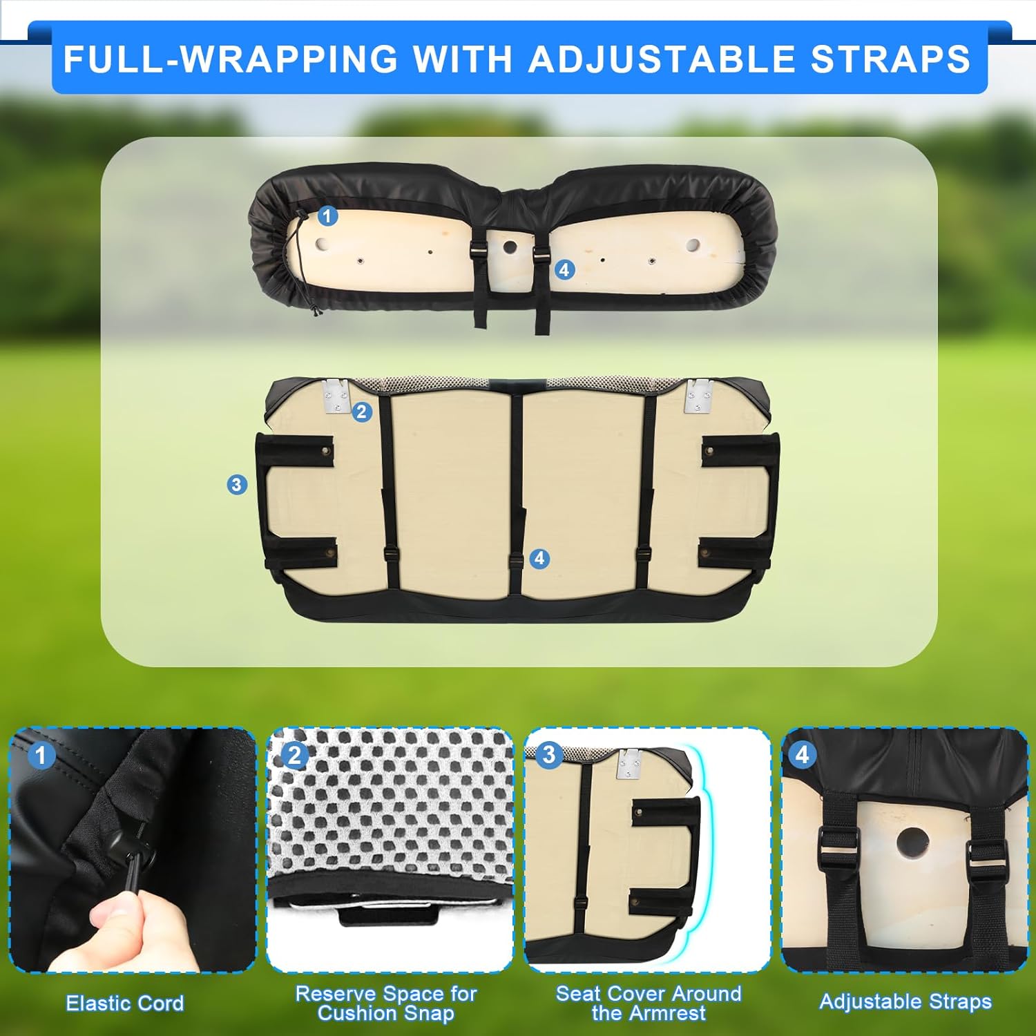 - Easy To Install: Just put the EZGO RXV breathable golf cart seat cover over the original cushion that will fit onto the EZGO RXV original seat. No need for using gun nail and removing the aged vinyl seat cover. With adjustable straps and retractable buckles design, these designs make the seat cover easy to secure