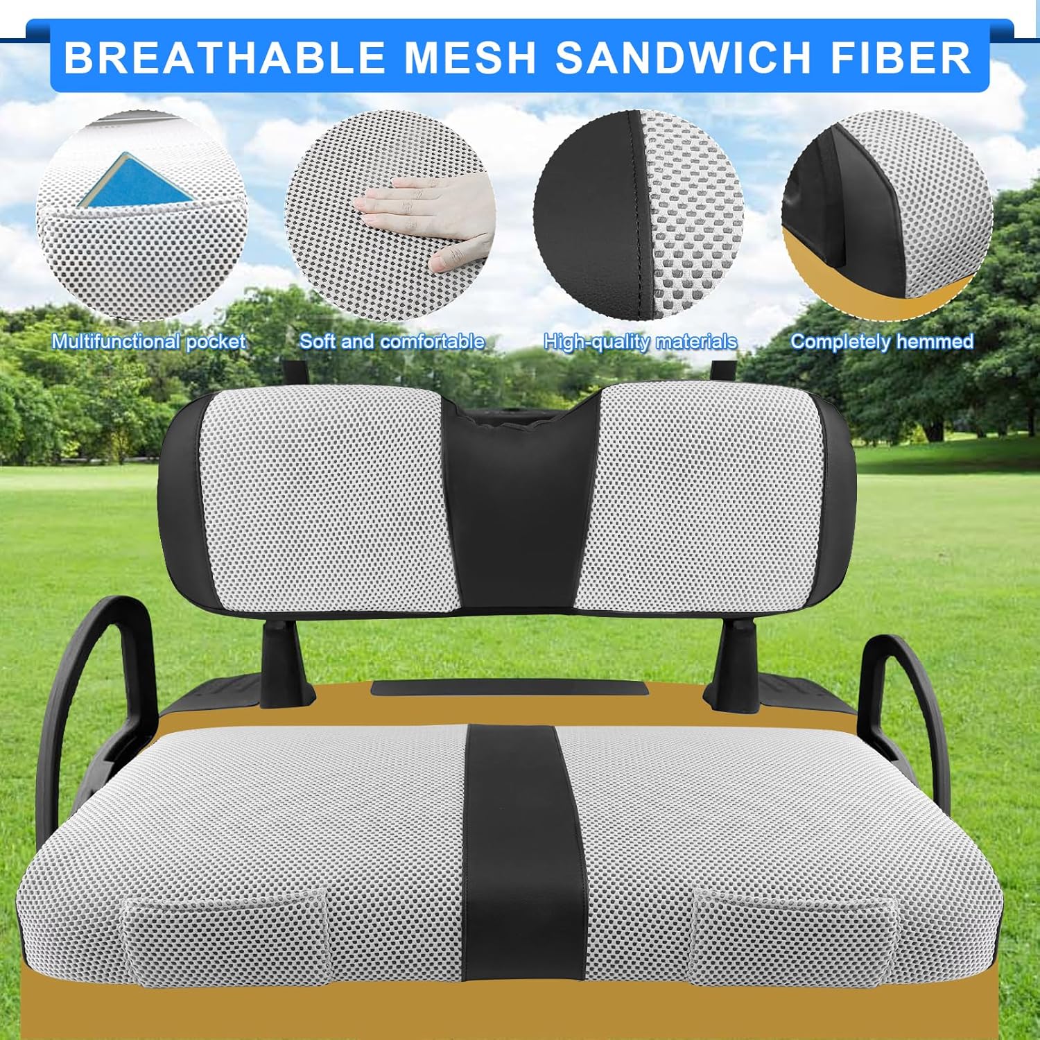 - Stylish Design: This upgraded EZGO RXV Golf Cart Seat Cover combines fabric cloth with artificial leather, featuring a distinctive mesh sandwich design. Full wrap-around design make the seat cover fit EZGO RXV original front seat and backrest, giving your golf cart a personalised look