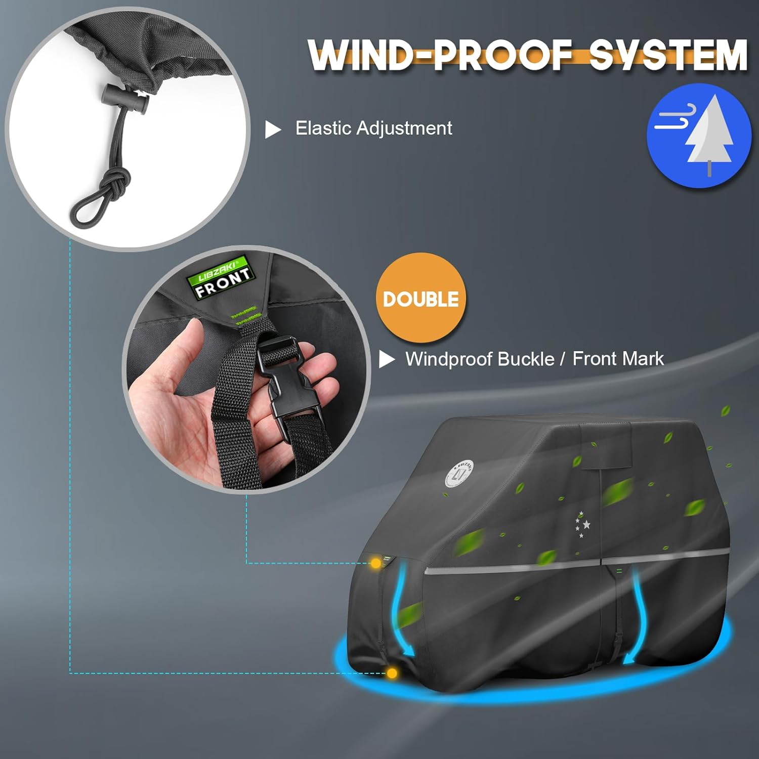 - Unique Exterior Design: ①Clever color matching and wonderful pattern embellishment design,Make your golf car cover stand out. ②Front,rear,left,right has adjustable windproof buckles,Adjustable Hem Cord,all-round windproof. ③Reflective strips on both sides have a night warning effect.