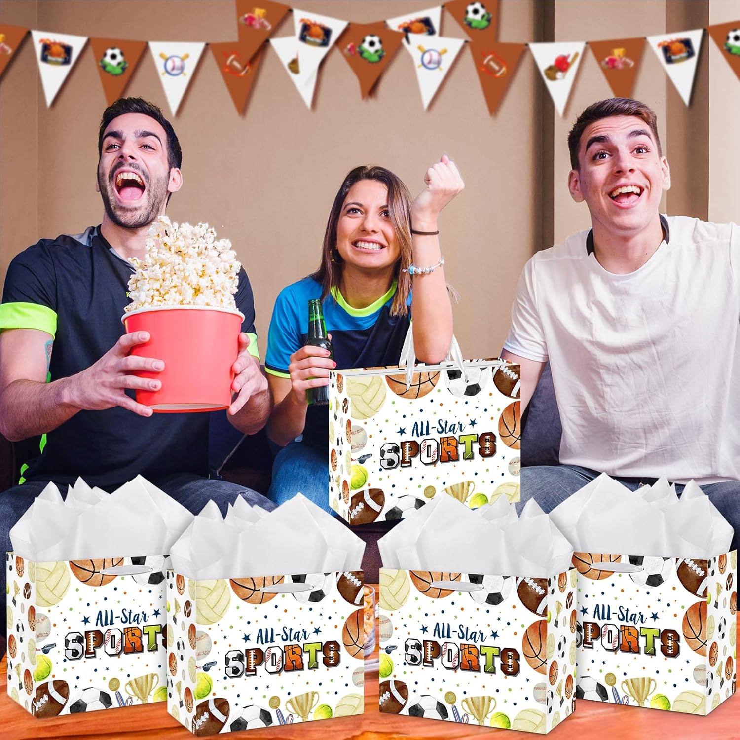 Sports Party Gift Bag, Sports Ball Gift Wrap Bag with Tissue Paper Card Decorations for Kids Men Soccer Tennis Football Baseball Team Birthday Party Favor Goodie Gifts Treat Wrapping Bag Supplies