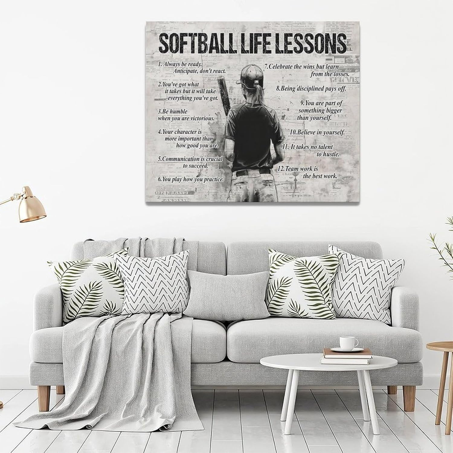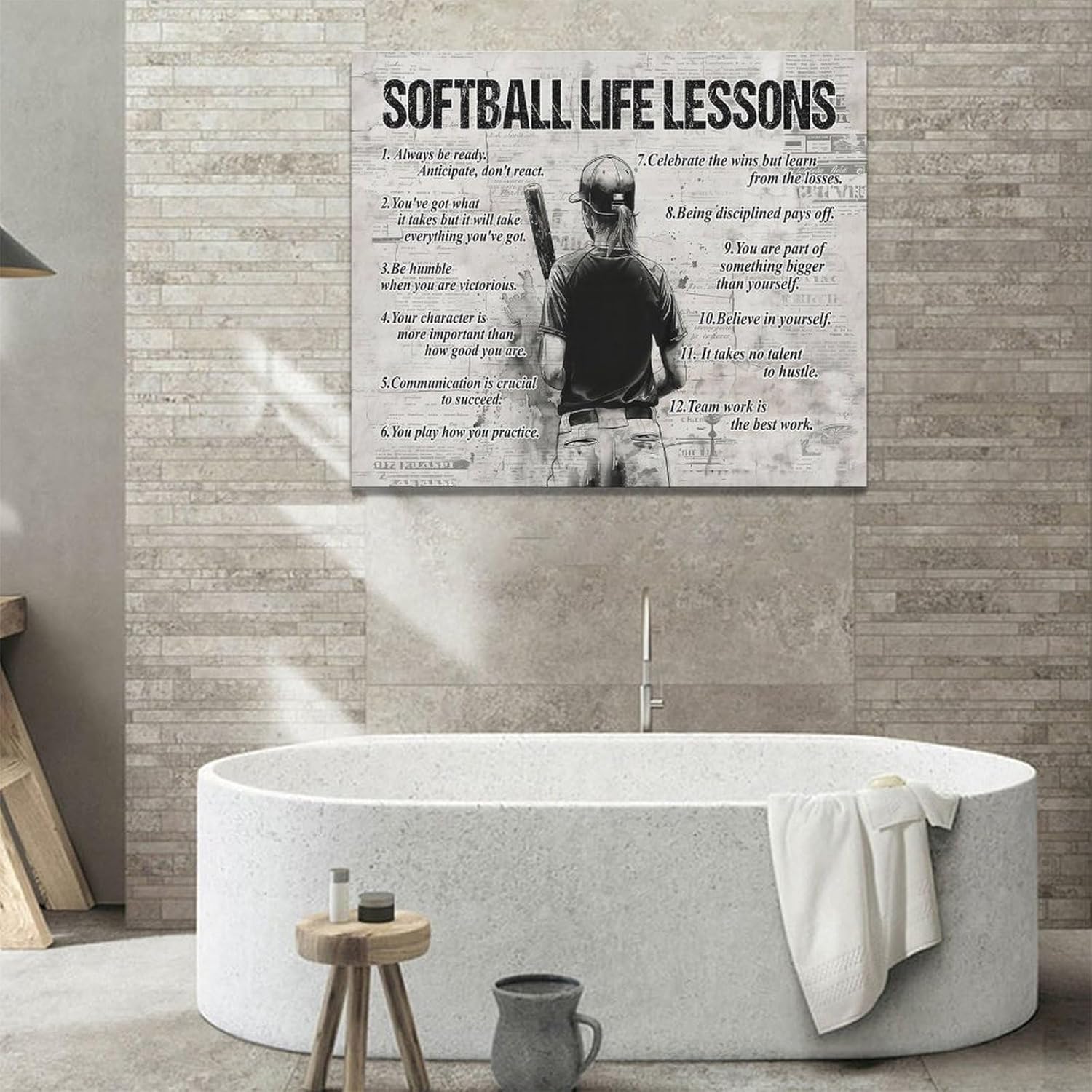 Softball Sports Wall Art Softball Life Lessons Wall Decor Softball Sign Retro Poster Boy Girls Men Room Motivational Decorations Canvas Print Painting Artwork for Bedroom Bathroom Living Room 24"x20"