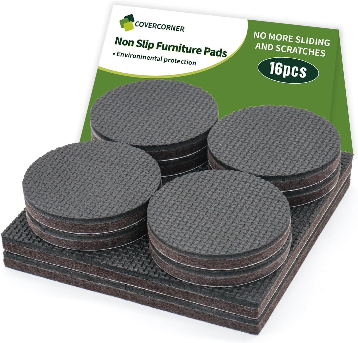 Non Slip Furniture Pads 16 PCS - 8 pcs 2” Round + 8 pcs 2" Square - Anti Slip Furniture Pads - Self Adhesive Rubber Feet Furniture Feet - Chair Leg Floor Protectors