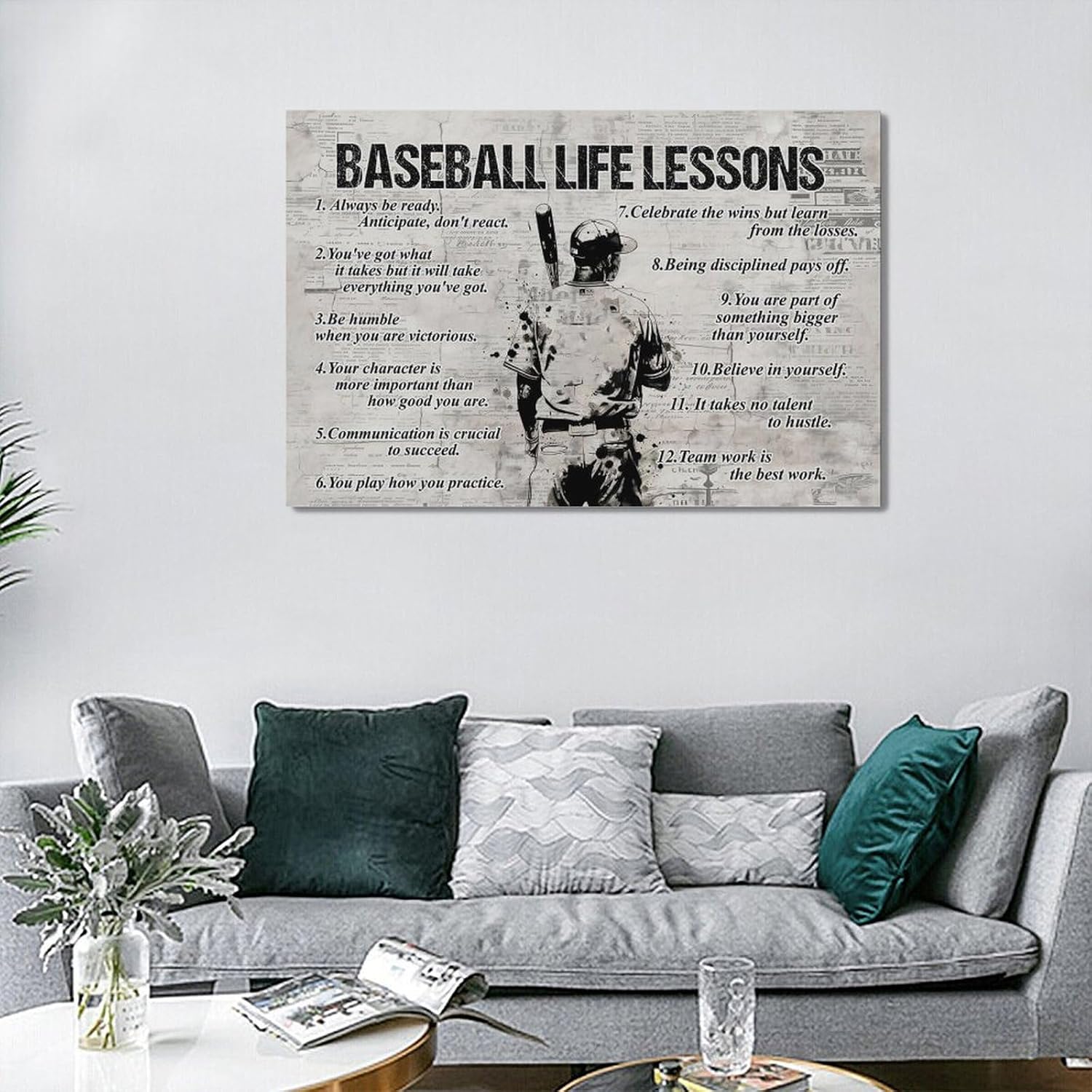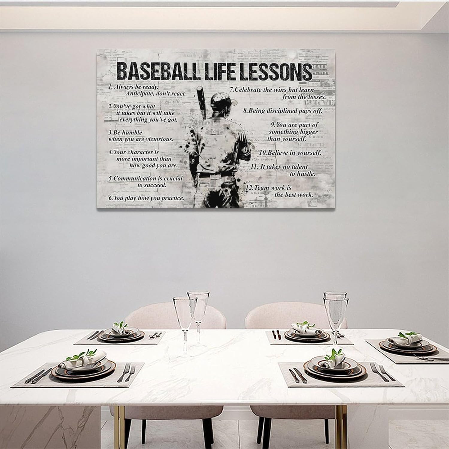 Baseball Sports Wall Art Baseball Life Lessons Wall Decor Baseball Sign Retro Poster Boy Men Room Motivational Decorations Canvas Print Painting Artwork for Bedroom Bathroom Living Room 24"x16"