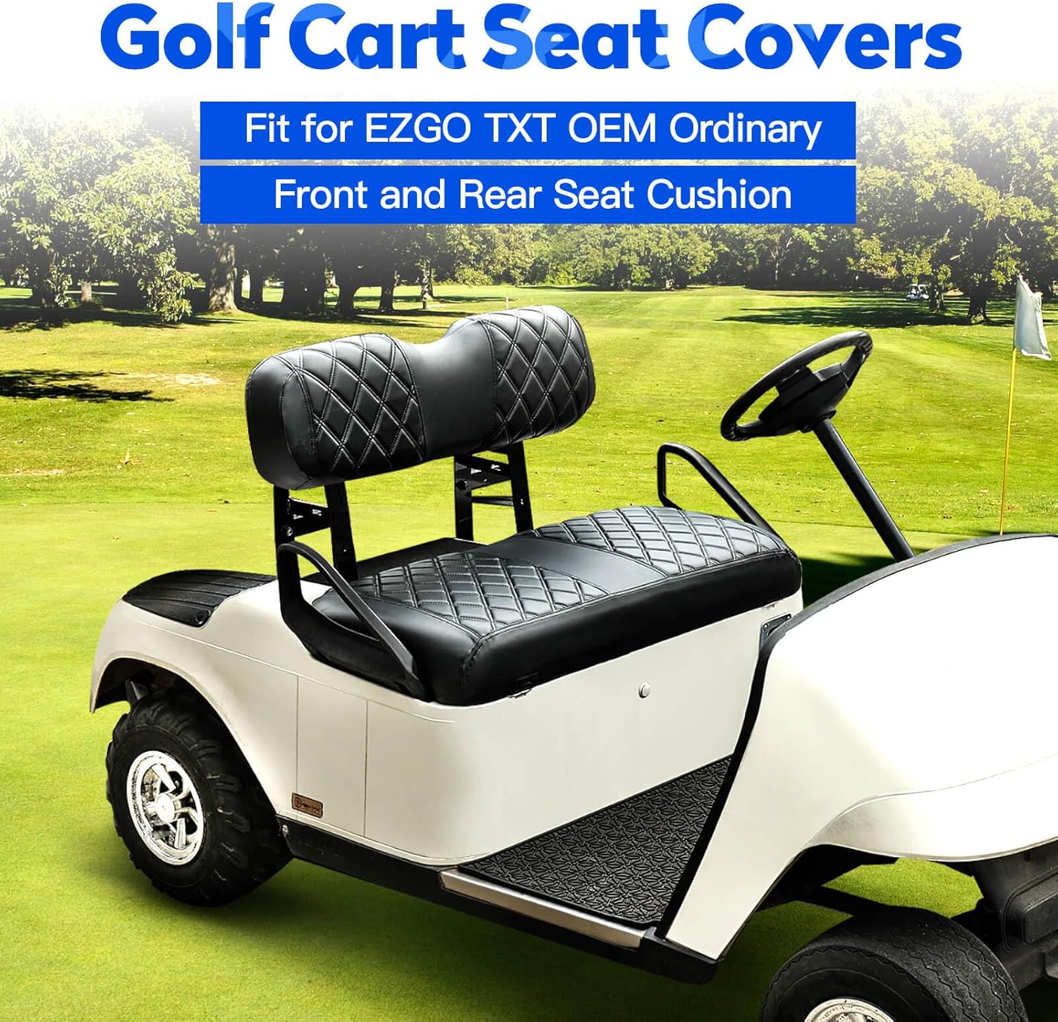 - Double Stitched Diamond Exterior Design: The golf cart seat covers are designed with a double stitched diamond pattern, adding a touch of luxury and elegance to your golf cart that is sure to turn heads on the course. Upgrade your golf cart's old seats.