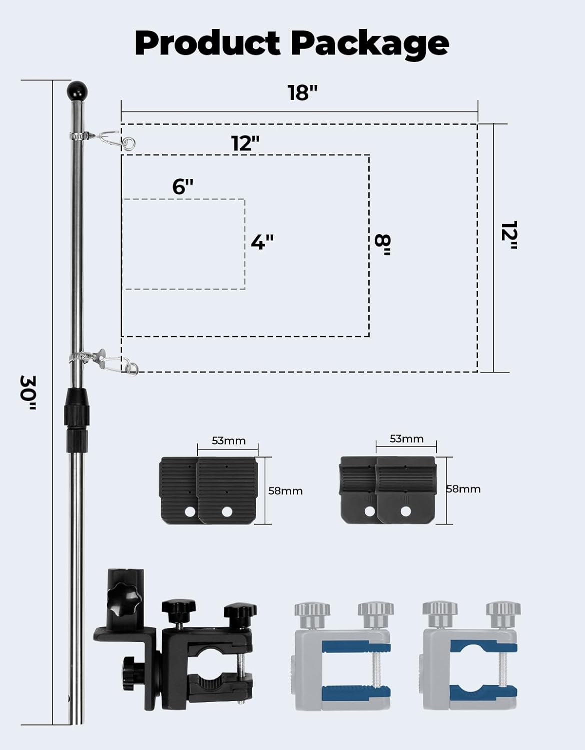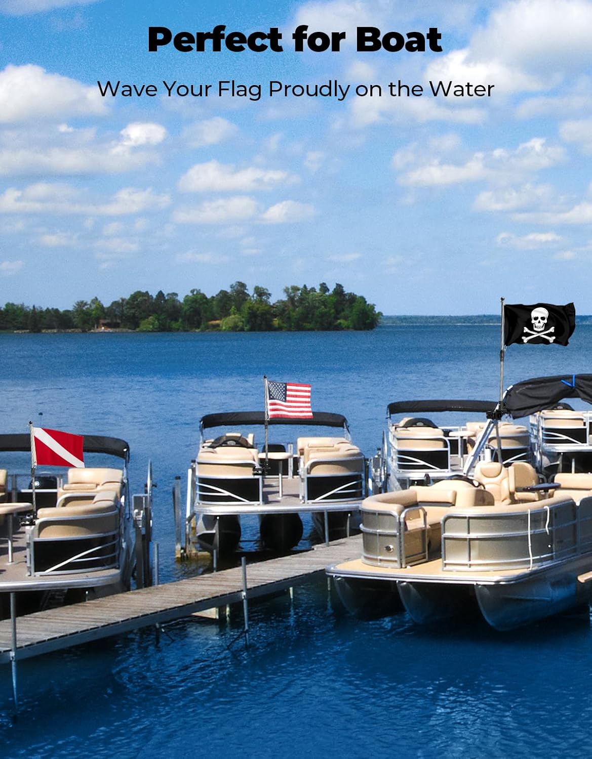 - FIT 12''x18''/8‘’x12''/4''x6'' FLAG: Easily install in under 3 min. Attach the pontoon boat flag with steel cable loops, and clamp the pontoon boat flag pole on the rail. Say goodbye to complicated setups