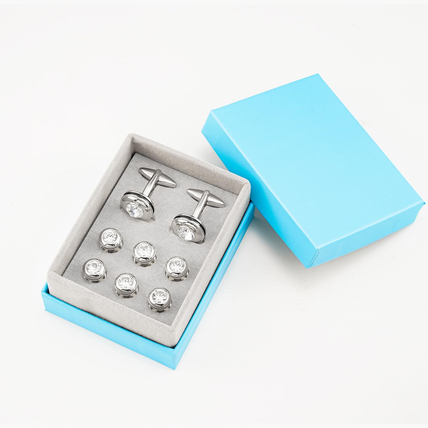 - CUFFLINKS AND SHIRT STUDS:1 pair cufflinks for men and 6 tuxedo shirt studs. Stainless steel color with white Will make you stand out from the crowd, Can add elegance to your shirt.