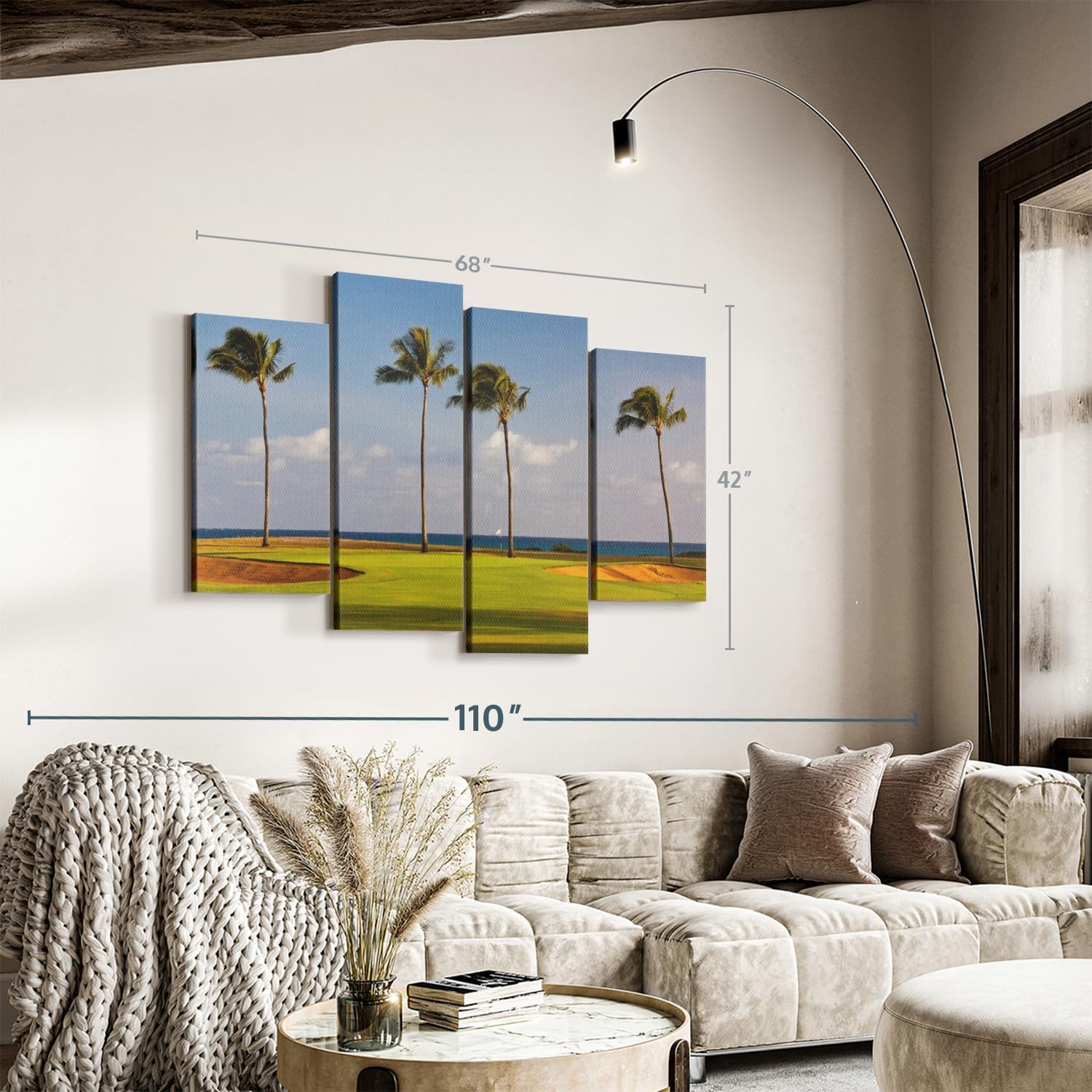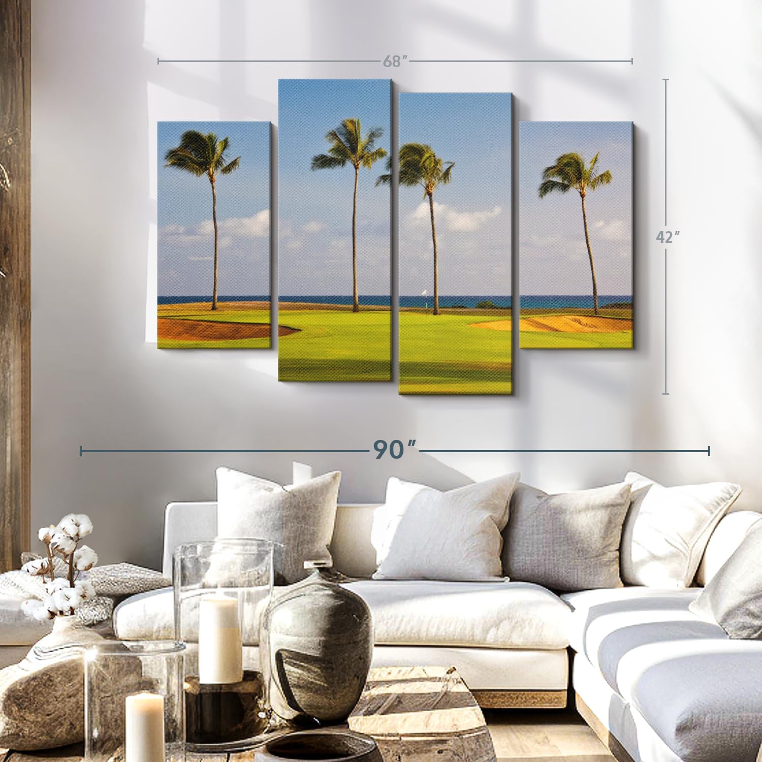 Elephant Stock Hawaiian Golf Course Wall Art - Horizontal Canvas - 4-Piece Living Room Wall Decor - Photography Sports Canvas Print - Green and Yellow Decor for Wall - 68" X 42"
