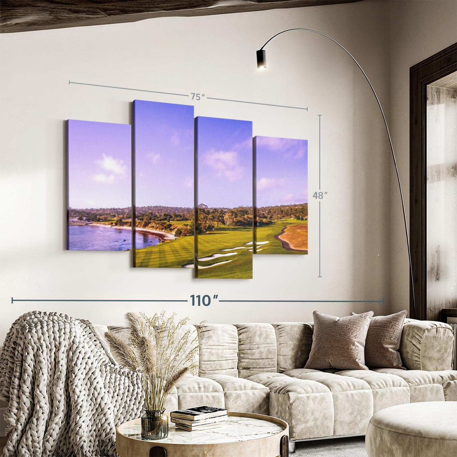 Elephant Stock Coastline Green Golf Course Wall Art - Horizontal Canvas - 4-Piece Living Room Wall Decor - Photography Sports Canvas Print - Blue and Gray Decor for Wall - 75" X 48"