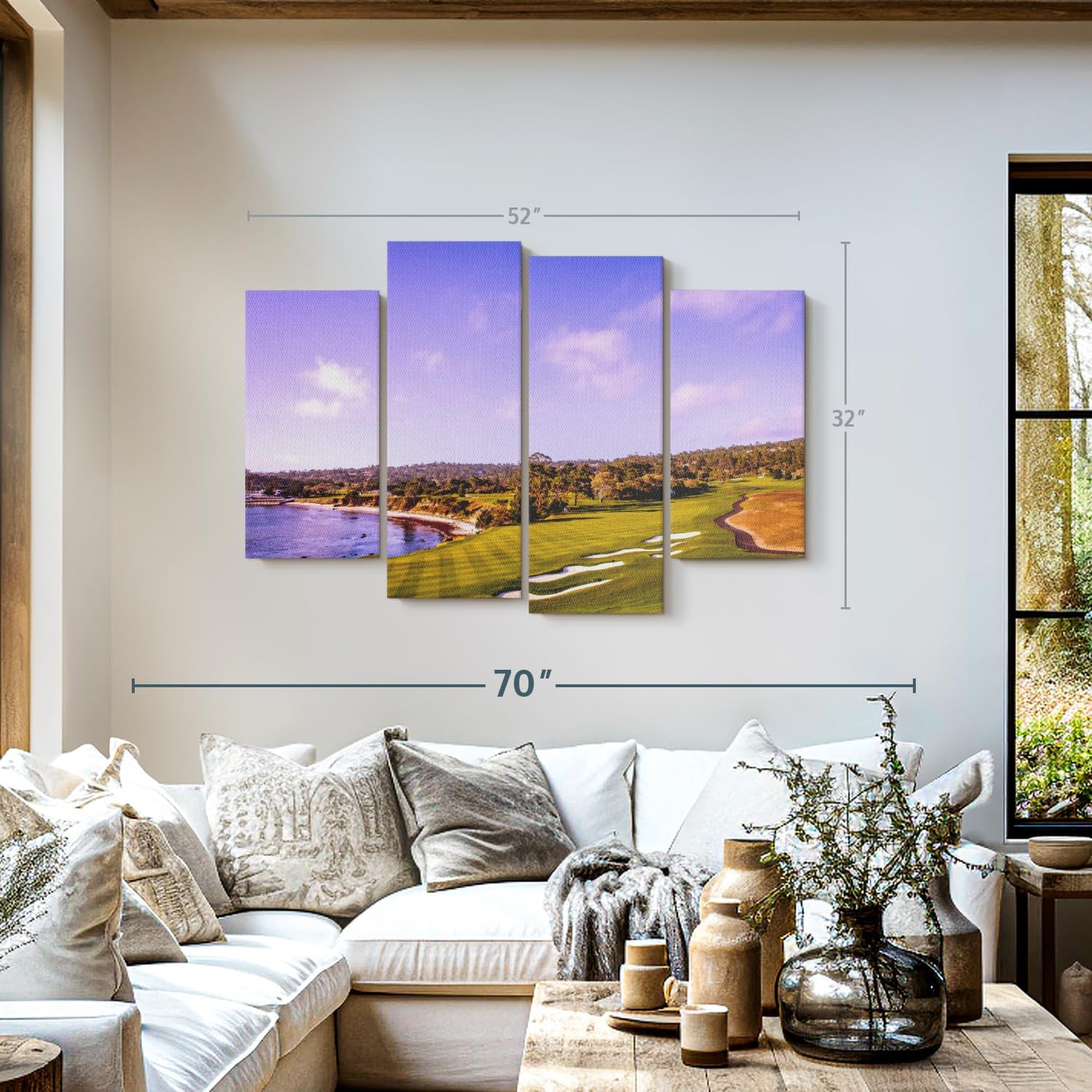 Elephant Stock Coastline Green Golf Course Wall Art - Horizontal Canvas - 4-Piece Living Room Wall Decor - Photography Sports Canvas Print - Blue and Gray Decor for Wall - 52" X 32"