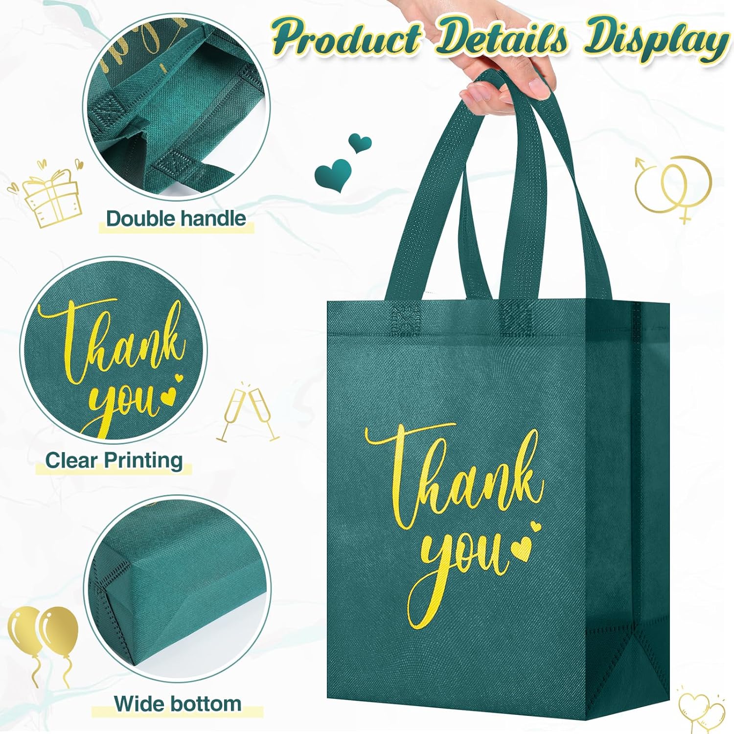 - Applicable for Parties and Daily Life: these thank you tote non woven bags are ideal for weddings and bridal showers, also suitable for birthday parties, baby showers, Thanksgiving, graduation ceremonies, afternoon tea parties, business banquets and other occasions; There is a large enough capacity to hold gifts, jewelry, lipstick, souvenirs, toys, clothes, snacks, candy and more, providing you and your guests with a wonderful party atmosphere