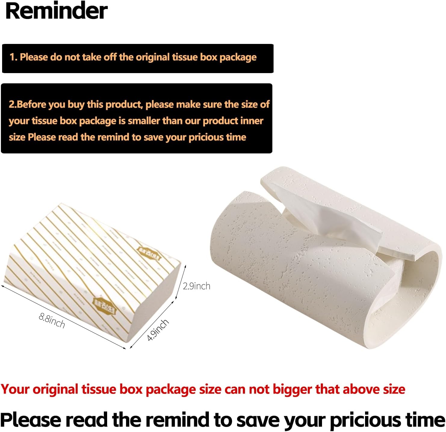 - Suitable Size - Product External Size: 8.86" L X 5.52"W X 3.43"H; It's suitable for a regular or standard rectangular of tissue box, so you don't need to remove the tissues from the original box. NOTE: The size of original tissue box can not exceed 8.8"(Length) x 4.9"(Width) x2.9"(Height)