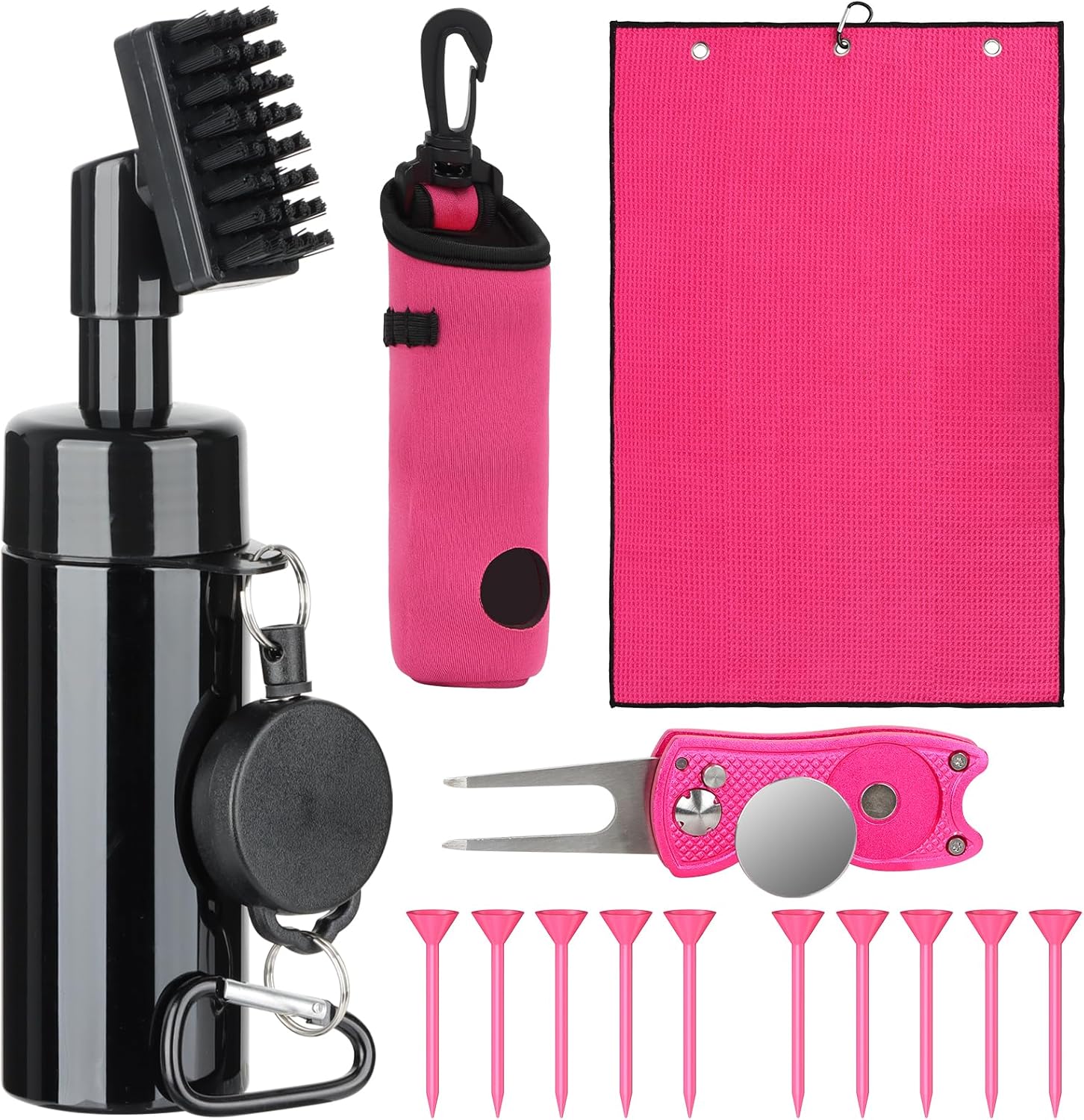 - Golf Accessories Cleaning Kit:This golf cleaning kit is especially designed for women golfers. It contains 1x golf club cleaner brush with water, 1x Pink microfiber golf towel, 1x golf divot repair tool, 1x pink golf ball bag and 10x golf tee set. This golf club cleaner kit has everything you need for the course and the cute pink colour is perfect choice for women!