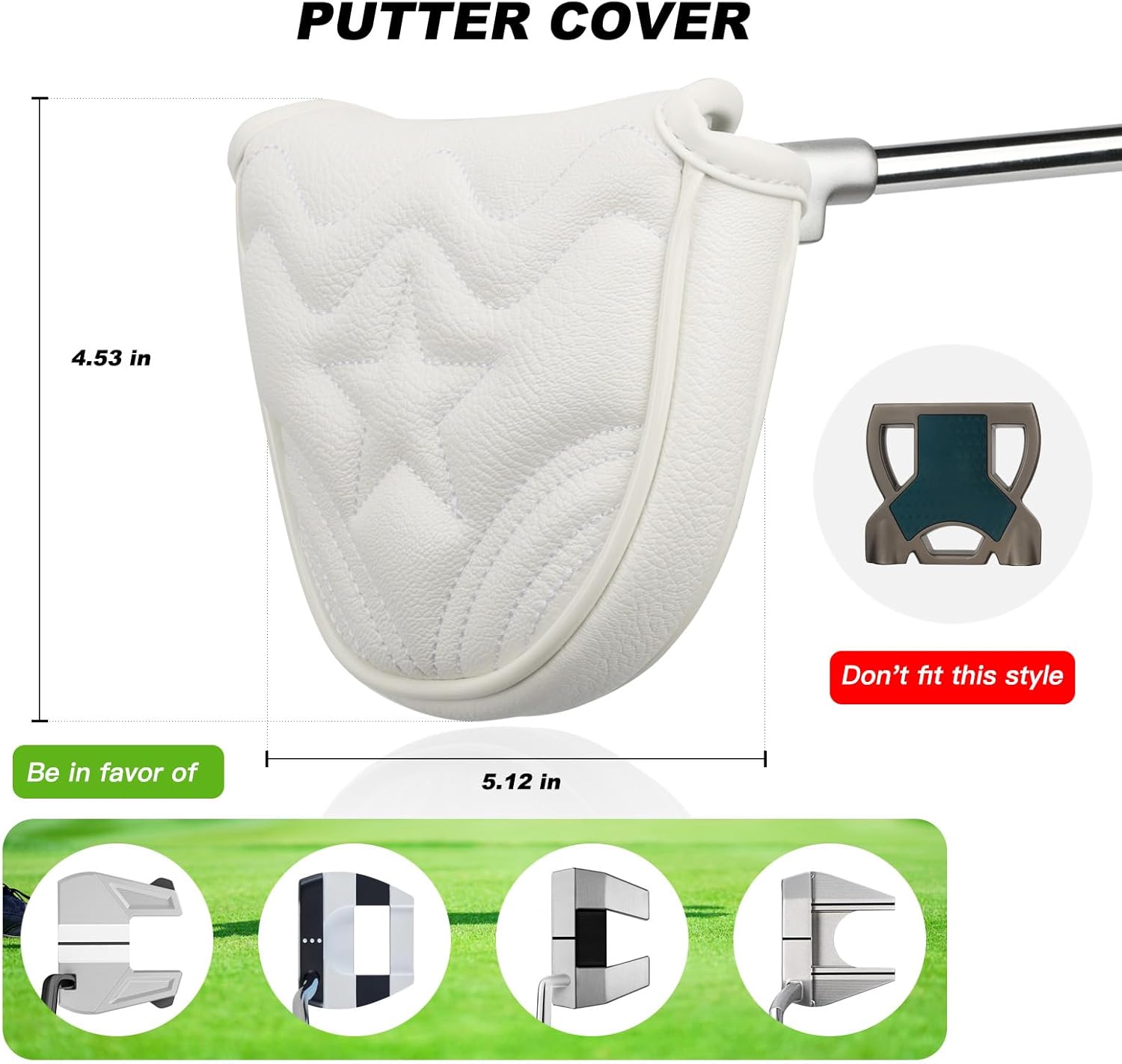 - Golf Club Covers for Mallet Putter: This golf mallet putter headcover is 4.53 x 5.12 in. Fits most mallet putters. Not suitable for center-shaft putters.