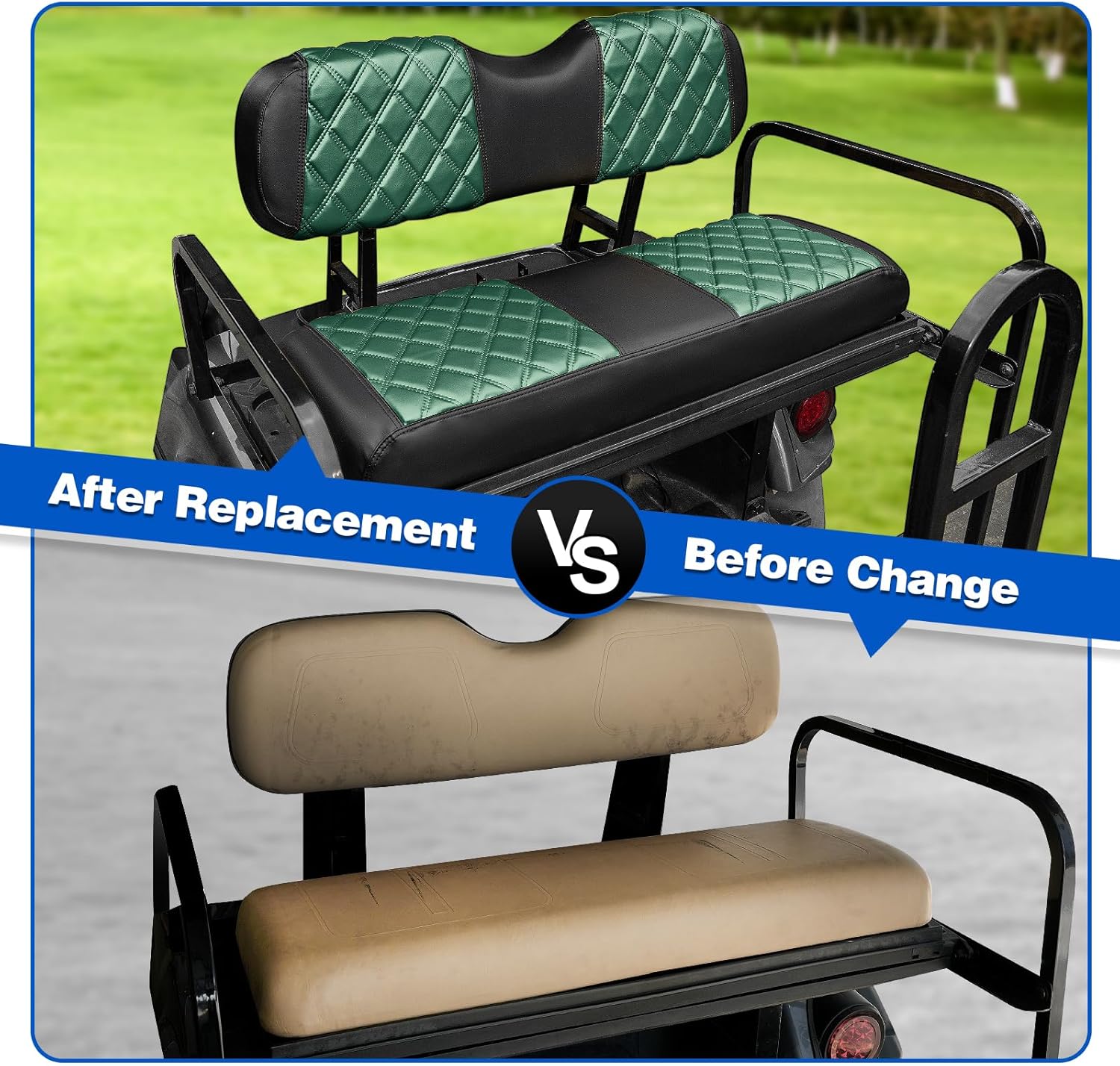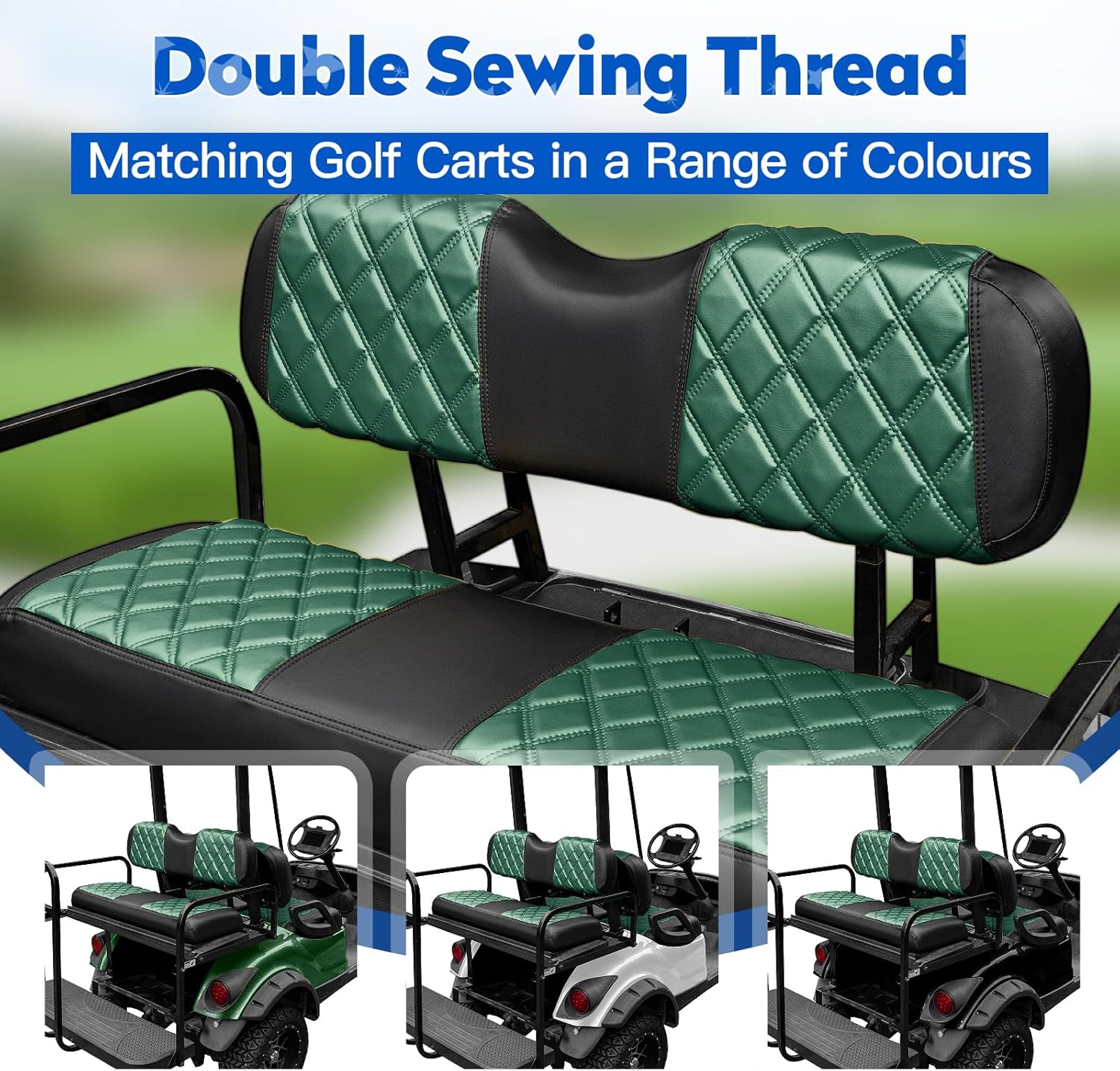 - Two-Colour Diamond Pattern Design: This golf cart back seat cover not only matches your original back seat perfectly, but also adds a distinctive, stylish and upscale look to your ride. The classic Dark Green and black colour scheme offers understated luxury, while the diamond pattern adds a stylish touch that will give your golf cart a new look.