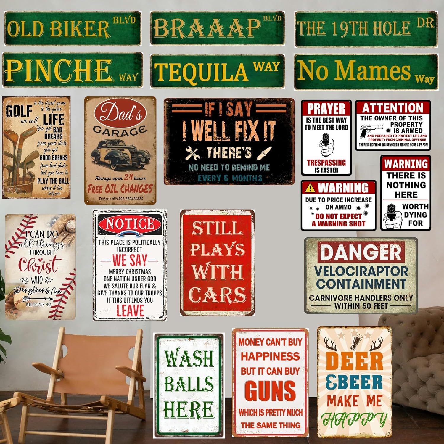 - Funny Metal Signs Size: garage signs for men 8x12 inches, thickened design, rounded corners, can be used indoors and outdoors, and will never rust and fade.