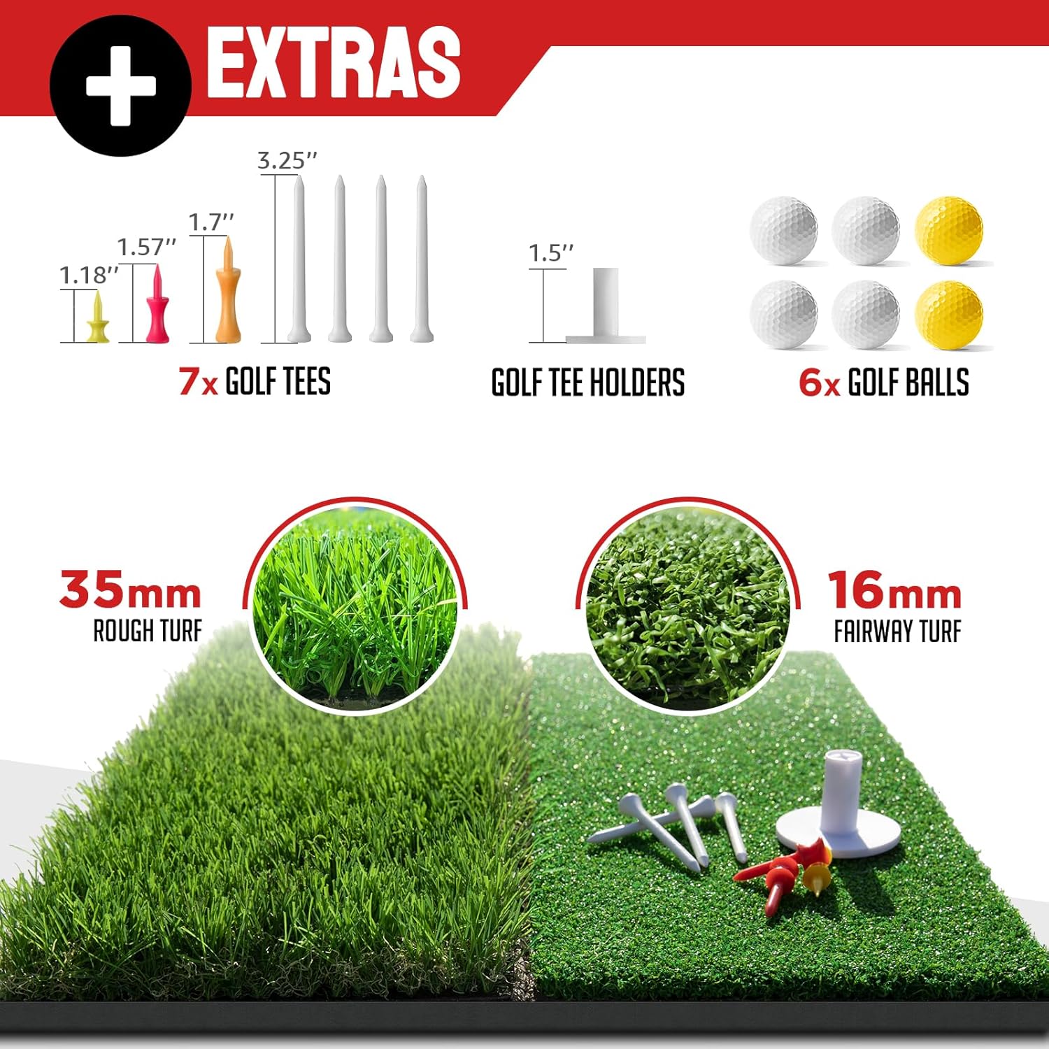 - Durable 5-Ply Reinforced Netting: Crafted from 5-ply anti-tear netting, this golf hitting net is designed to endure the impact of real golf balls at speeds up to 200 mph. This ensures long-lasting use, allowing you to practice powerful shots; This all-in-one golf net for backyard includes a 10x7ft golf driving net, 1 golf mat, 1 chipping net, 6 foam practice balls, 7 golf tees, 1 rubber tee, 4 ground stakes, and 1 carry bag