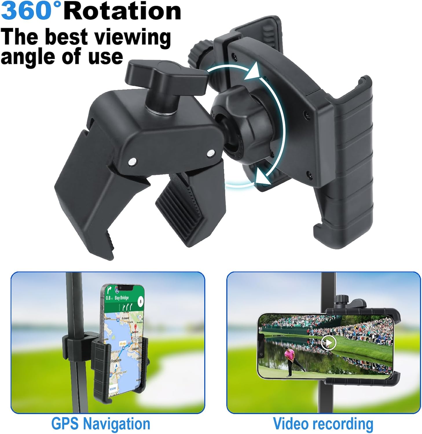 - 【UPGRADED STRONG CLAMP】The clamp of this phone mount boasts a tool-free installation with a adjustable twist lock and interior anti-slip silicone padding for a secure grip. Your phones will stay stable and secure on the golf cart, no matter how rough the road gets.